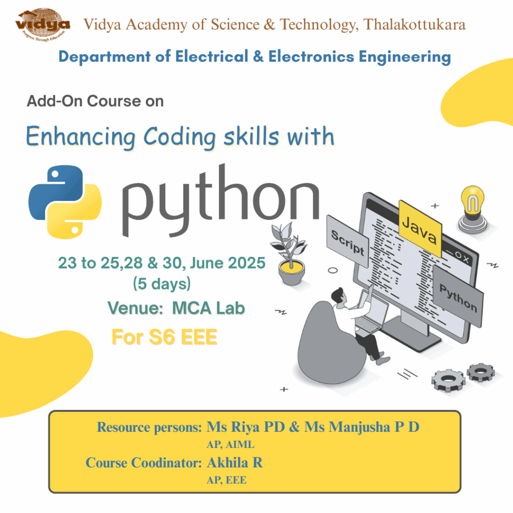 The Editorial Team of News & Events joins the entire Vidya fraternity in extending heartiest congratulations to the entire EEE Dept on the successful conduct of the session that helps the participants gain confidence in coding and improved their analytical skills. |