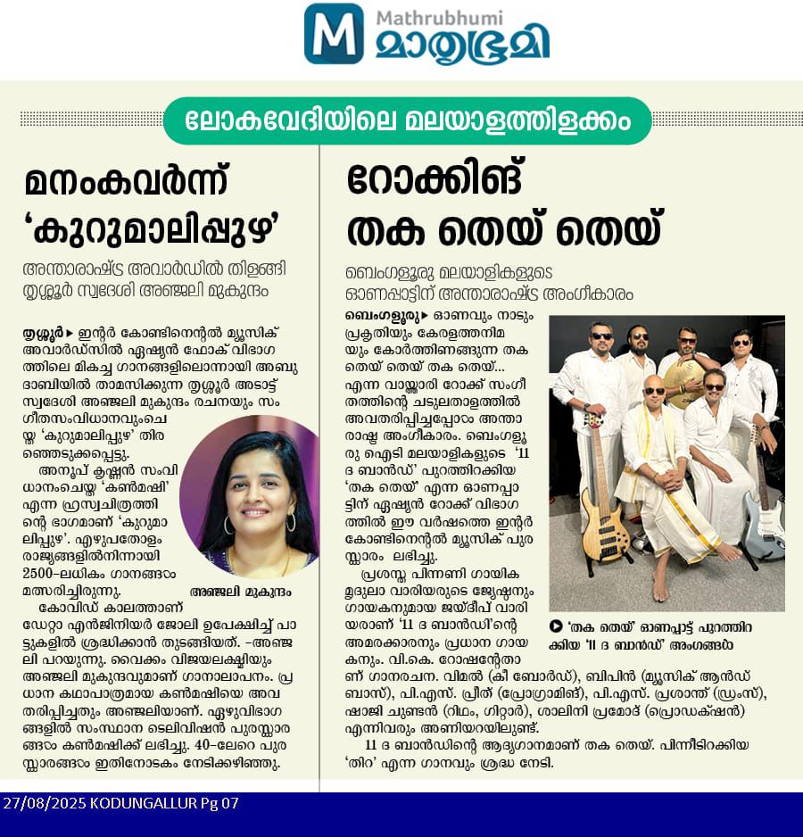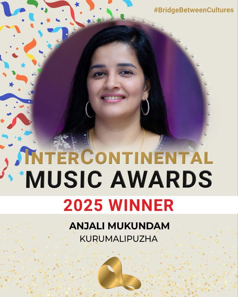 Well known for her contributions to Malayalam music, Ms. Anjali Mukundam (Playback singer and music composer, 2003–07 Batch, ECE Dept) continues to inspire audiences with her heartfelt performances, blending tradition with emotional depth. The Editorial Team of News & Events, with great joy and pride, shares an international recognition that affirms her standing as one of the most inspiring voices in contemporary folk music. Ms. Anjali Mukundam has been awarded the Best Folk Music (Asia) honor at Inter Continental Music Awards for her soulful rendition “Kurumalipuzha” from the short film Kanmashi. Singer Ms Anjali Mukundam released her latest song “Kurumalipuzha”, which has been well-received both nationally and internationally. The song, part of a new album, showcases Anjali’s vocal prowess and has garnered widespread appreciation. “Kurumalipuzha” has already crossed 2,500 views shortly after its release. Anjali Mukund is known for her contribution to Malayalam music and continues to inspire audiences with her soulful performances.