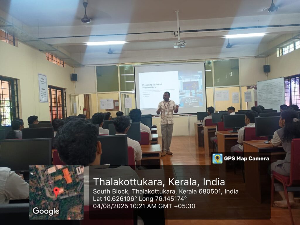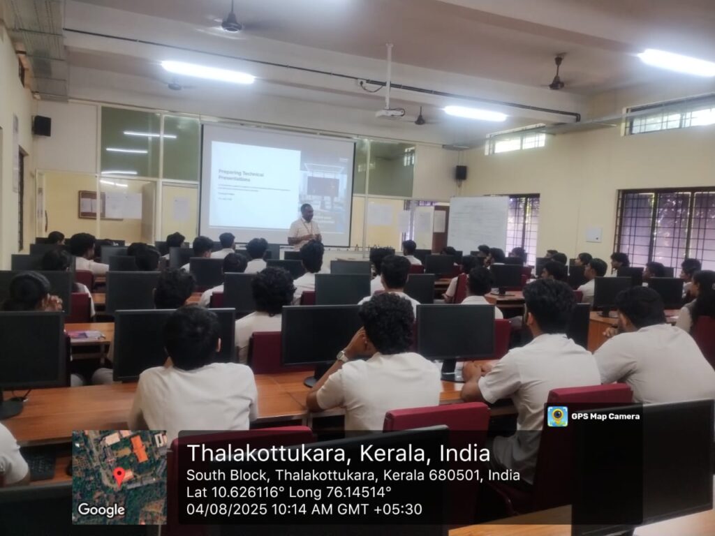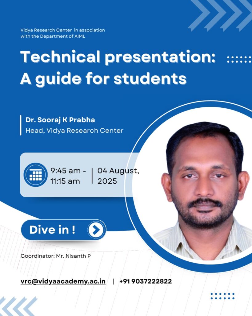 With an aim to enhance students’ technical presentation and research competencies, the Department of Artificial Intelligence & Machine Learning (AIML), Vidya Academy of Science & Technology, in association with the Vidya Research Center (VRC), organized a technical talk on “Technical Presentation: A Guide for Students” on 04 August 2025.he session, held at the AIML Lab, provided students with practical guidance on preparing and delivering effective technic