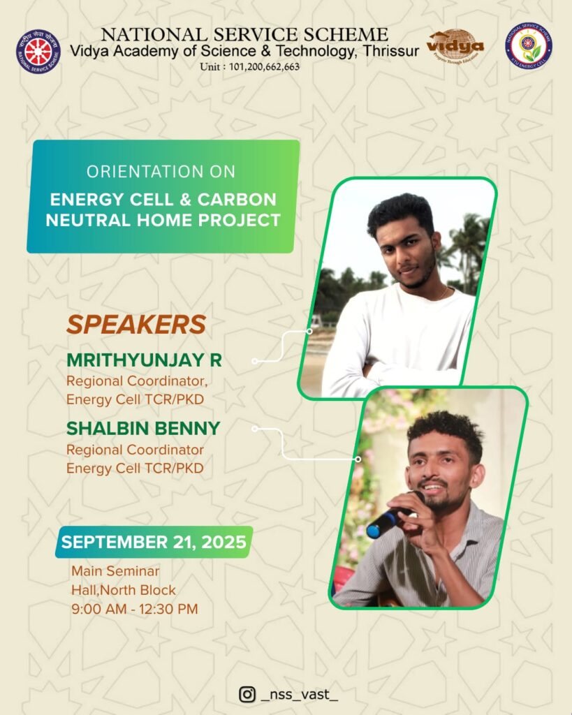 The speakers elaborated on the objectives and vision of the Energy Cell, including the promotion of sustainable energy practices, awareness on energy conservation, and implementation of renewable energy projects. They also shared successful case studies from previous initiatives and motivated volunteers to actively participate in future projects.The vote of thanks was proposed by Anamika Sebastian ( NSS Volunteer Secretary, S5, ECE Dept).