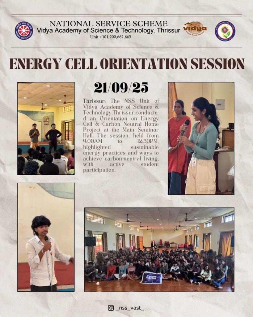 The orientation program for the Energy Cell flagship initiatives of KTU NSS was successfully conducted on 21 September 2025. The event aimed to familiarize newly enrolled NSS volunteers with the objectives, activities, and responsibilities associated with the Energy Cell’s flagship programs.