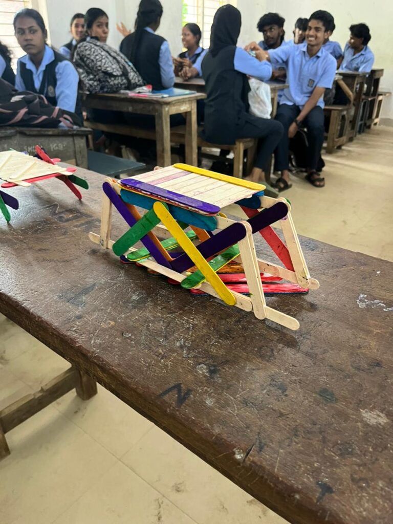 The session was handled by Dr. Abhilasha P. S. (HoD CE Dept), Ms. Anu Maria Antony (Asst Prof, CE Dept) and Mr. Kiran Babu A. R. (Asst Prof, CE Dept).The program commenced with a brief introduction by Mr. Kiran Babu, followed by the hands-on activity. Students were divided into groups, and each group was provided with ice cream sticks (popsicles) and gum to construct a girder model. Model structures were also projected on the screen to provide guidance and design ideas.Students collaborated in teams, sharing innovative ideas and applying basic engineering principles in their creations. After the construction phase, the load-carrying capacity of the modeled girders was evaluated by Ms. Anu Maria Antony, which generated great enthusiasm and curiosity among the students.
