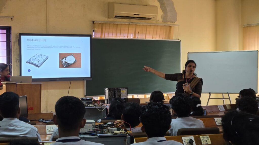 The session began with an introductory talk emphasizing the importance of hardware knowledge in today’s technology-driven world. Students were introduced to key internal components such as the motherboard, processor (CPU), RAM, storage devices, power supply unit, expansion cards, cooling systems, and various cables and connectors. External peripherals, including input and output devices, were also explained through live demonstrations.