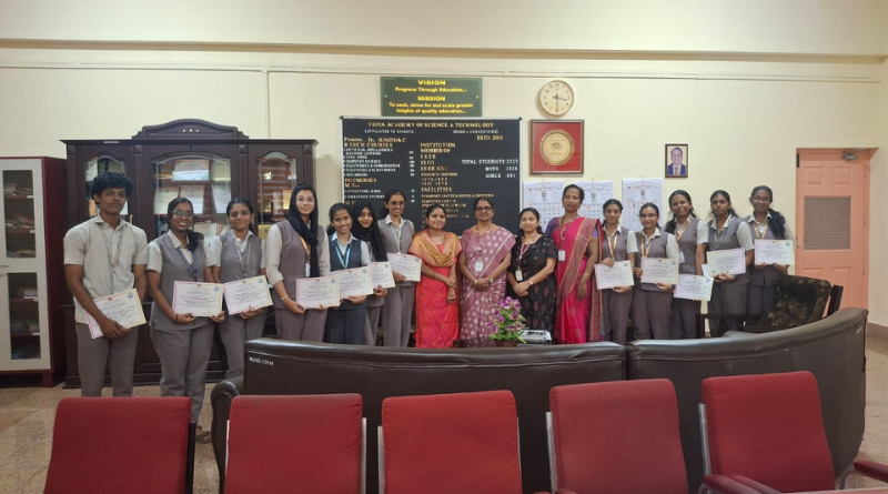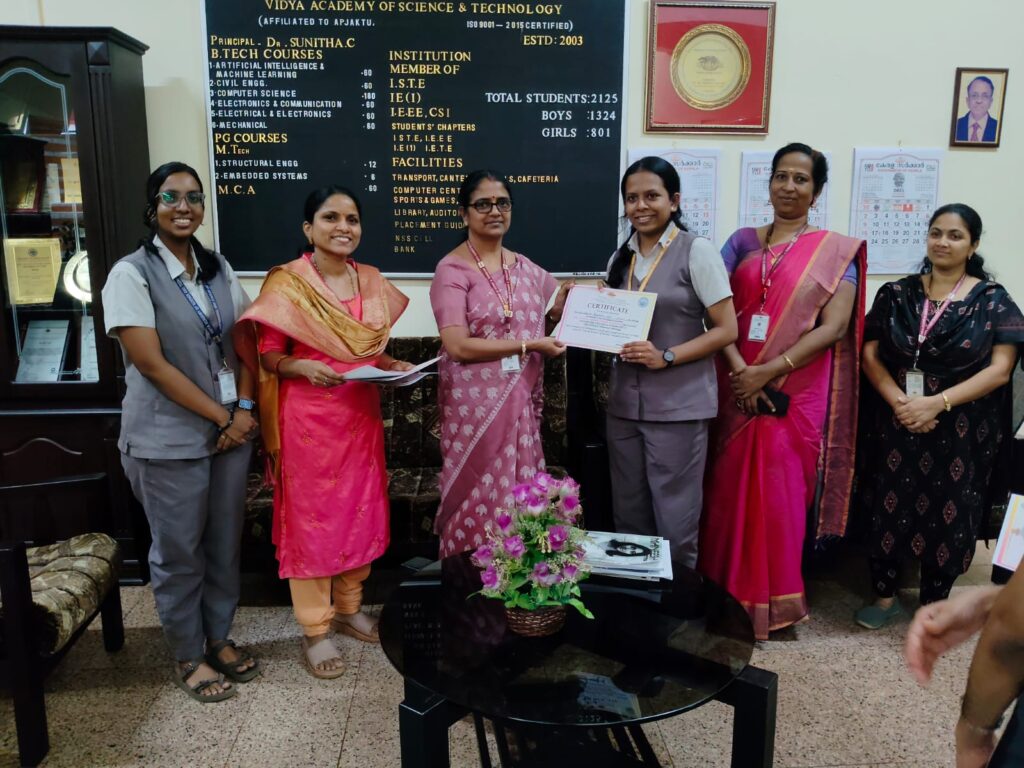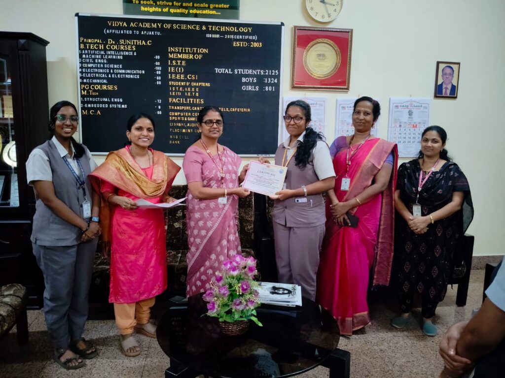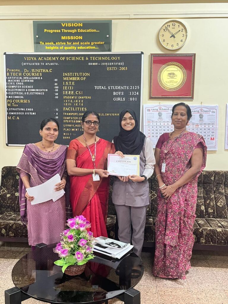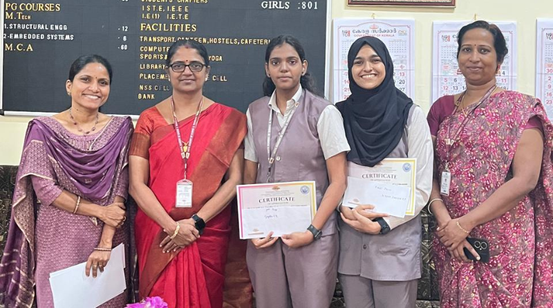 | Ms Resmi K. Rajan (Convener, VWEC, Asst. Prof – Sr. Grade, ECE Dept) addressed the gathering, appreciating the participants for their confidence and commitment to the cause of women’s empowerment. Ms. Ponsy Paul (Asst. Prof – Sr. Grade, CE Dept) and Ms. Surabhi M. S. (Asst. Librarian), who served on the judging panel, highlighted how the contestants showcased exceptional articulation and insightful perspectives, effectively emphasizing the importance of accelerating gender equality efforts and inspiring positive social change. Their dedication and teamwork greatly contributed to the event’s success. In appreciation of their pivotal role in organizing and ensuring the smooth execution of the competition, Dhrishya Anil (S6, CSE Dept), Aswin (S5, CE Dept), and Sruthi Cinto T (S5, CE Dept) were honored with certificates |