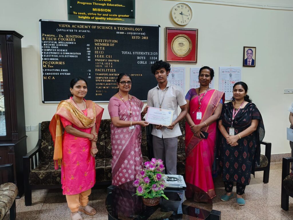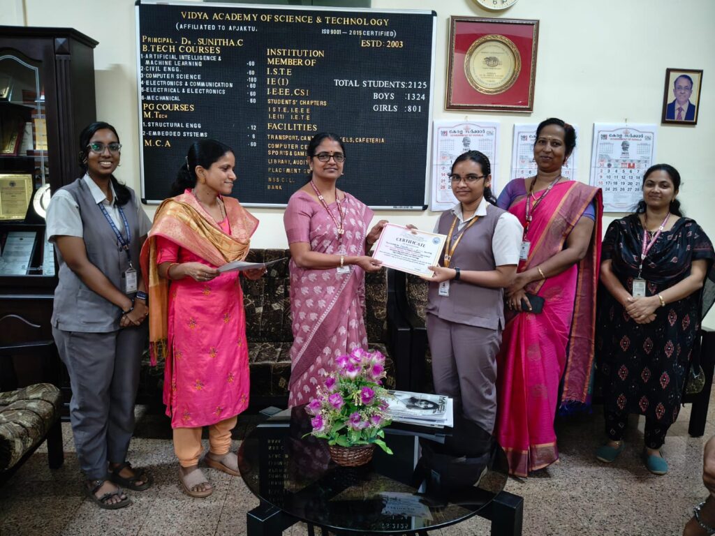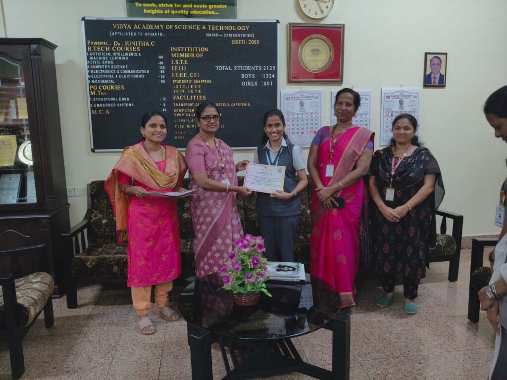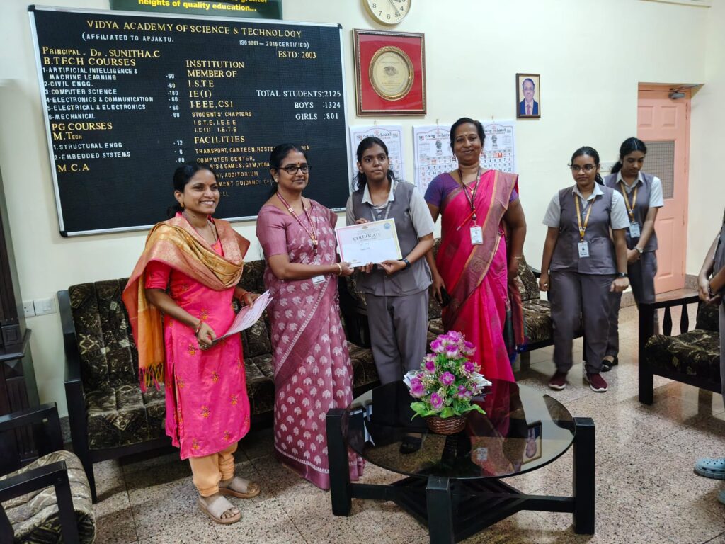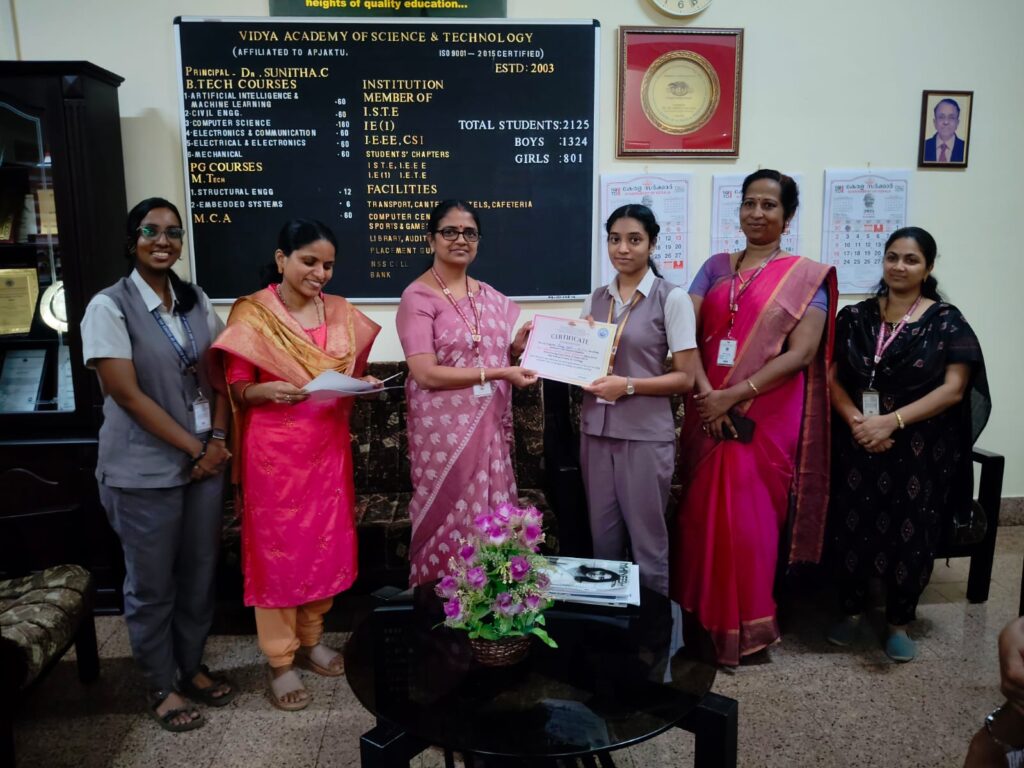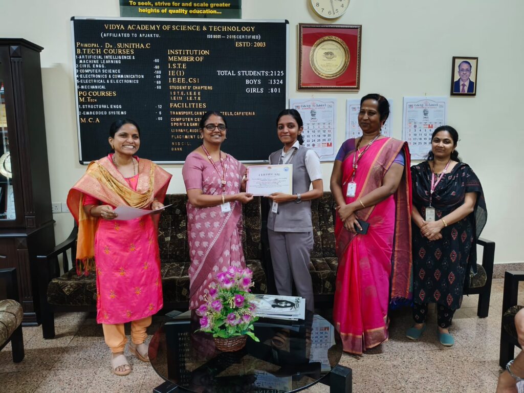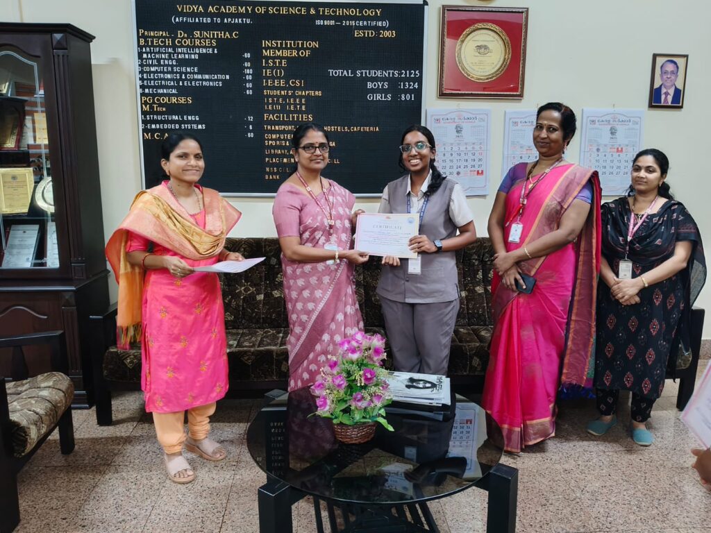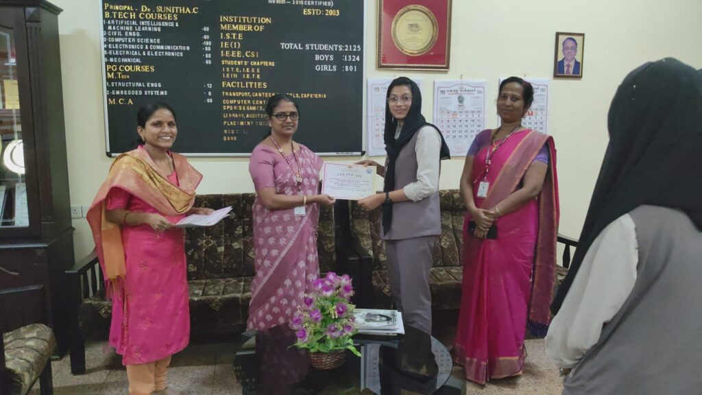 | To acknowledge the enthusiastic involvement of every contestant and to honour the winners, a function was held on 15 October 2025 at Principal’s office. All participants were presented with certificates, underscoring the inclusive and encouraging spirit of the event. Dr. Sunitha C (Principal) presented cash prizes and certificates to the winners in recognition of their outstanding performances. Dr. Sunitha appreciated their thought-provoking contributions, which truly stood out among the participants. |