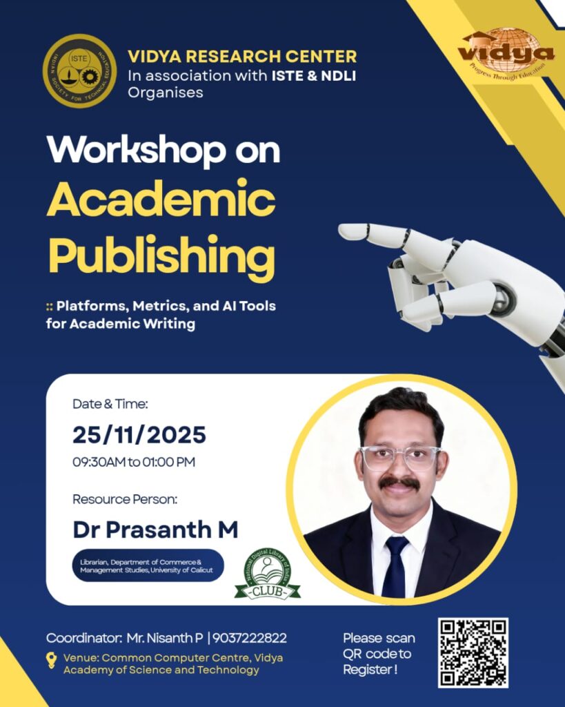 The workshop successfully achieved its aim of equipping faculty members with essential knowledge and tools for effective academic publishing.The event was co-ordinated by Dr. Sooraj K Prabha (Head,VRC, Prof, ME Dept), Mr. P. C. Girish Kumar (Librarian) and Mr Sarath Babu Ramachandran (Secretary, ISTE VAST, Asst Prof – Sel. Grade, ME Dept)
