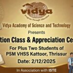 As part of the event, Vidya Academy proudly appreciated the toppers of Plus One from PSM VHSS Kattoor. Their dedication and performance were acknowledged to inspire peer motivation and academic excellence among all attendees.