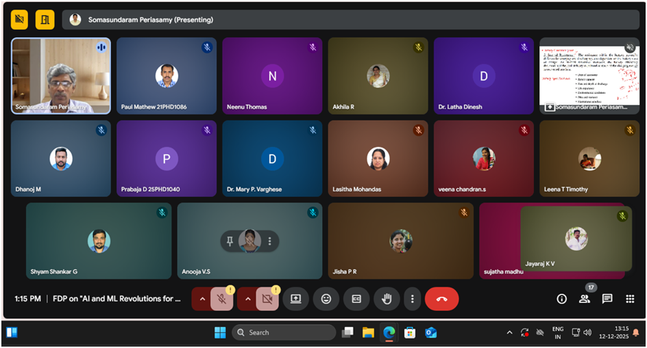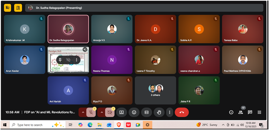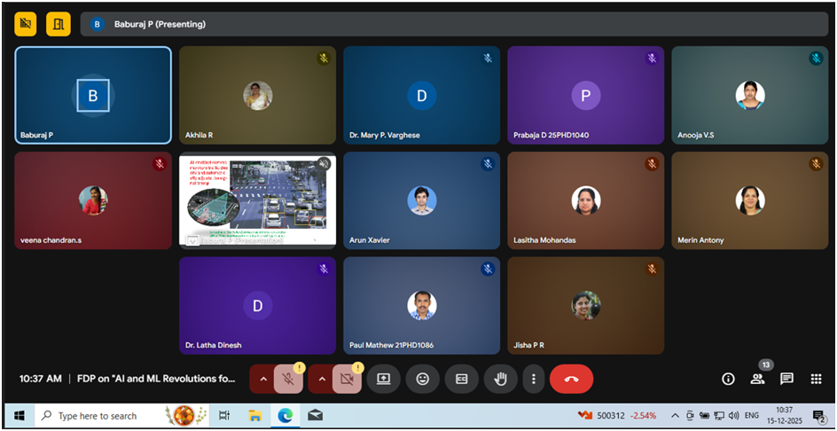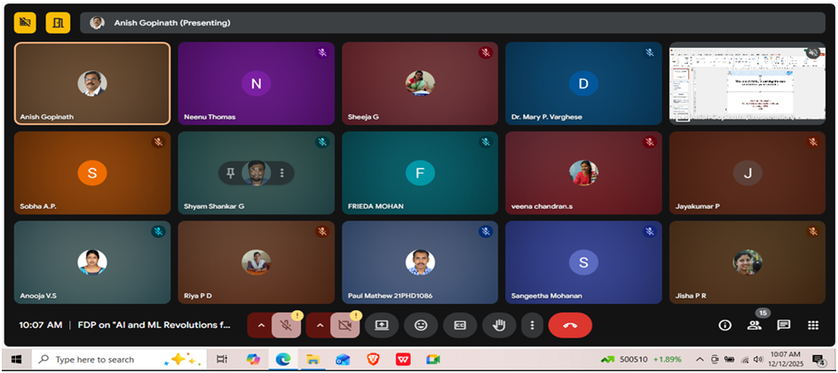 The FDP was inaugurated on 08 December 2025 at 10.00 am with a prayer. Dr. Mary P. Varghese (HoD, EEE Dept) welcomed the gathering. The function was presided over by Dr. Sunitha C (Principal). Ms. Akhila R (Asst. Prof – Sr. Grade,EEE Dept) introduced the chief guest, Dr. Anish Gopinath (Scientist/Engineer, VSSC, Thiruvananthapuram) who formally inaugurated the FDP. In his address, Dr. Anish Gopinath emphasized the need to shape the next generation of engineers using AI and ML techniques. The inaugural session concluded with a vote of thanks by Ms. Neenu Thomas (FDP Co-ordinator, Asst. Prof – Seln. Grade,EEE Dept) .
