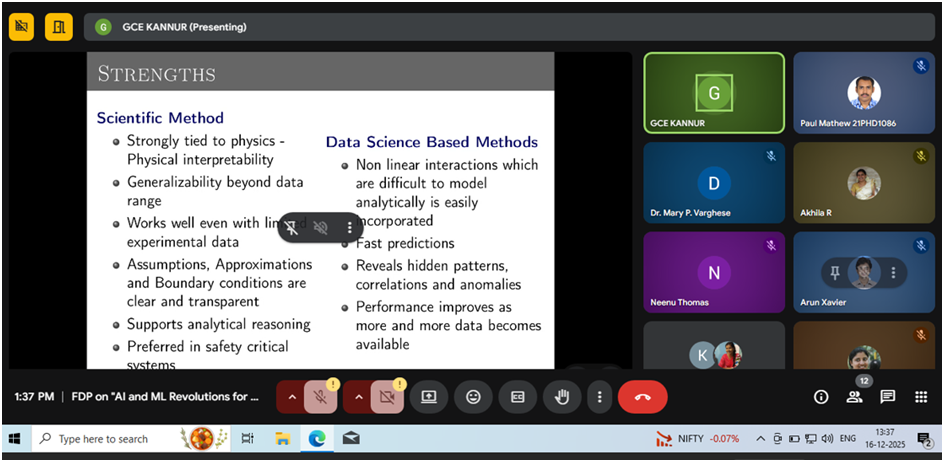 Afternoon: Dr. Sukesh A. (Associate Professor, Government Engineering College,Kannur) presented An Overview of AI in Electromagnetics. The session concluded with an interactive discussion followed by the official vote of thanks by the FDP organizers.