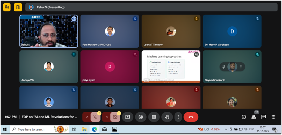 Afternoon: Dr. Rahul Satheesh (Assistant Professor, Amrita, Ettimadai) discussed Forecasting Techniques for Renewable Energy Generation and Demand using AI and ML. - Day 6 (16/12/2025):