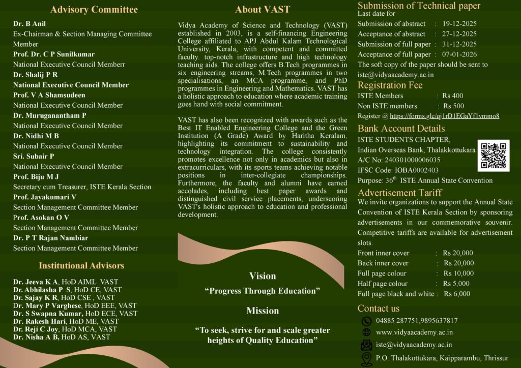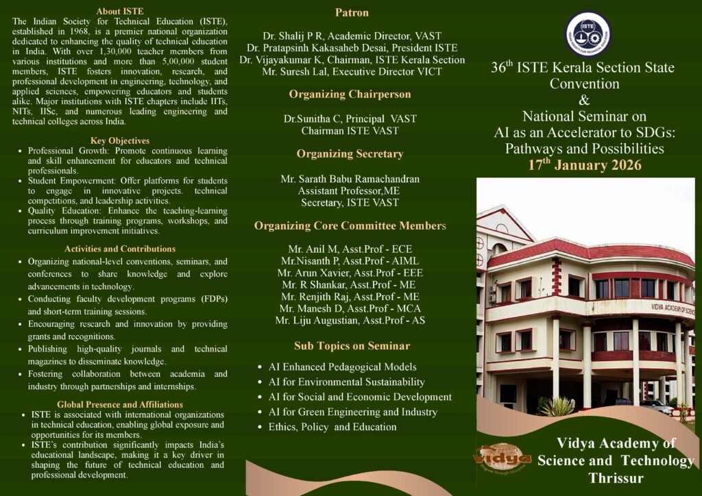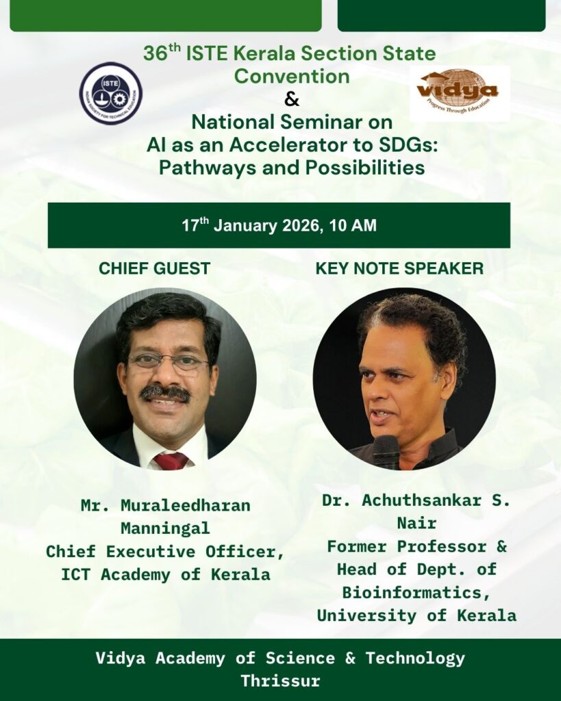 Vidya Academy of Science & Technology proudly hosts the forthcoming 36th ISTE Kerala Section State Convention and National Seminar on ‘AI as an Accelerator to SDGs: Pathways and Possibilities’. This distinguished gathering brings together educators, researchers, industry leaders, and student innovators to explore emerging trends, exchange best practices, and foster meaningful knowledge sharing that advances excellence in engineering and technology education