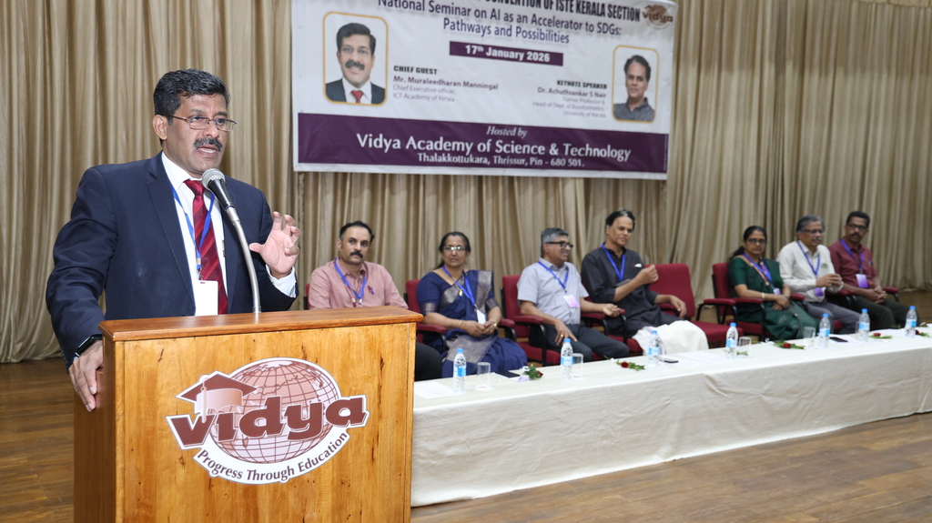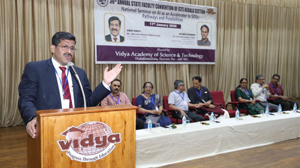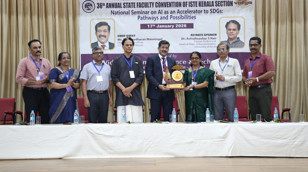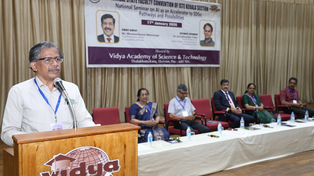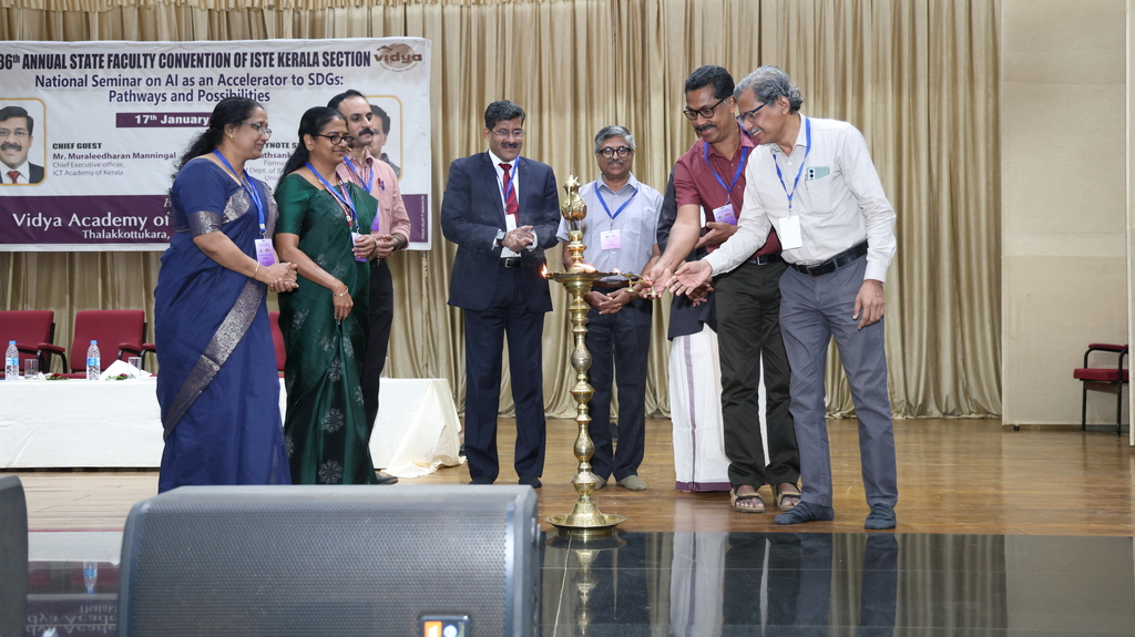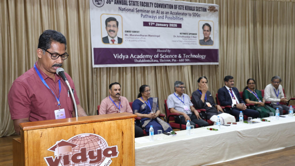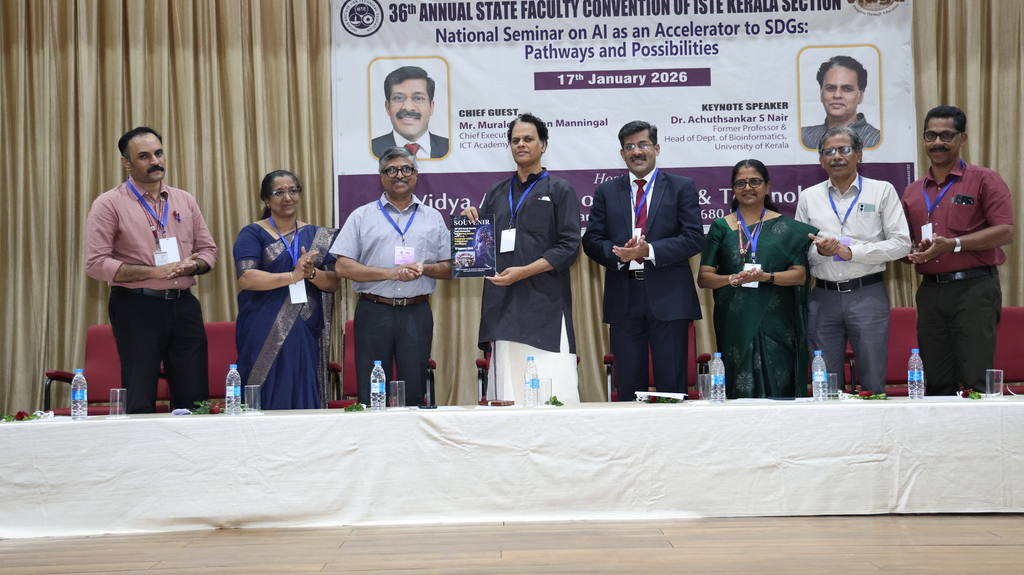 | Indian Society for Technical Education (ISTE) brought together eminent academicians, professionals, and researchers every year with its prestigious ISTE Kerala Section State Convention & National Seminar every year. Vidya Academy of Science & Technology has the privilege to host 36th ISTE Kerala Section State Convention and National Seminar on ‘AI as an Accelerator to SDGs: Pathways and Possibilities’ on 17 January 2026 to discuss emerging trends, research findings and practical applications of AI in supporting sustainable development. The event featured keynote addresses, technical paper presentations, and deliberations aimed at enhancing academic excellence and encouraging AI-driven solutions for societal benefit |