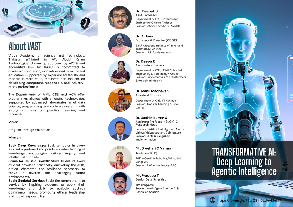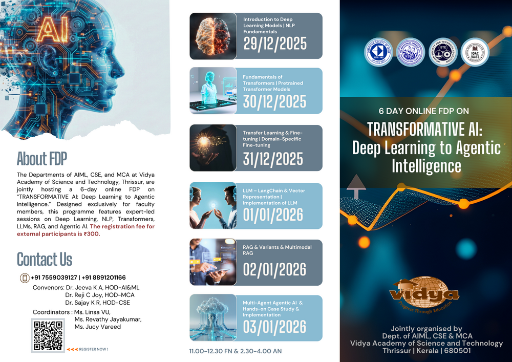 Vidya Academy of Science and Technology organized a six-day Faculty Development Programme (FDP) titled “Transformative AI: Deep Learning to Agentic Intelligence” from 29 December 2025 – 03 January 2026 in online mode.