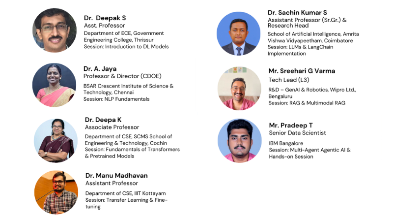 | Sessions 5 & 6 | Transfer Learning and Fine-Tuning, Advanced Fine-Tuning – Domain-Specific Adaptation,LoRA, QLoRA | Dr. Manu Madhavan, Assistant Professor, IIIT Kottayam |