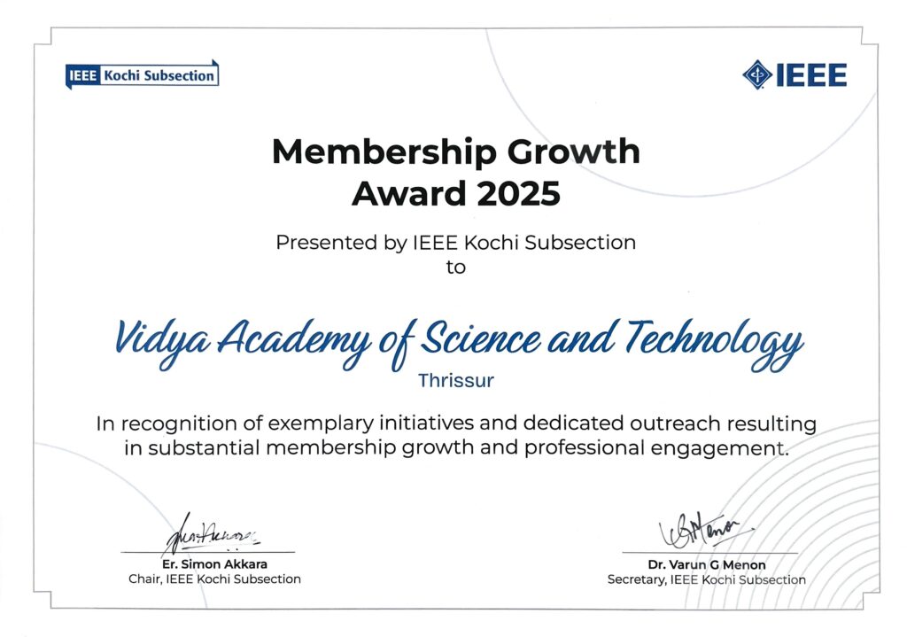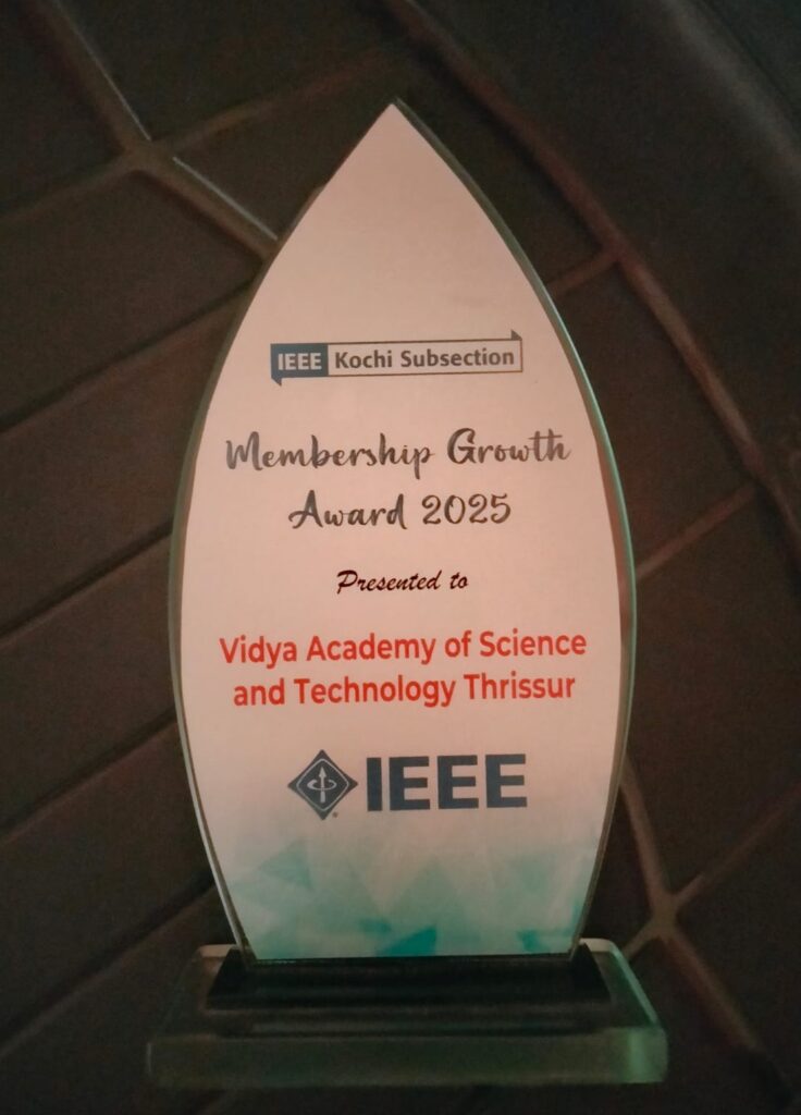 The award, comprising a certificate and memento, was received by Mohammed Hashim K S (IEEE SB VAST Chair, S4, ME Dept) and  Niharika K Thilak (IEEE SB VAST Vice-Chair, S2, CSE Dept) during the Annual General Body Meeting (AGM) held on 31 January 2026 at Cochin Suburban Club.Guided by Mr. Santumon S D (IEEE Faculty Counsellor, VAST,Asst Prof, ECE Dept), IEEE SB VAST is fostering creativity, engagement and innovation through its activities at Vidya.