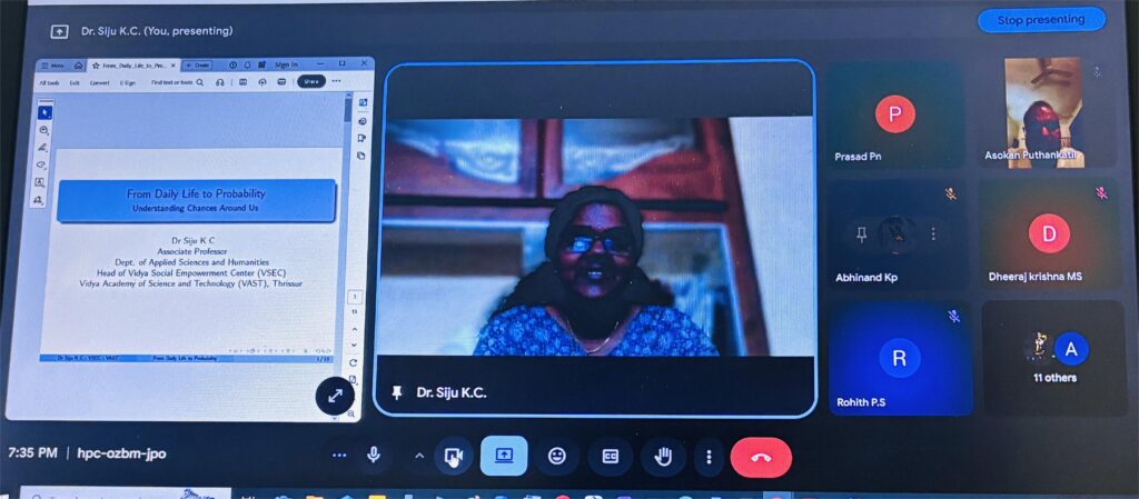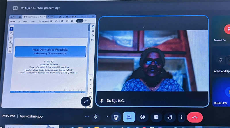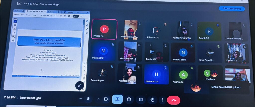 Dr. Siju K. C (Head, VSEC and Asso. Prof, AS Dept) conducted an online academic enrichment session on 31 January 2026 from 7:30 pm to 8:30 pm for the scholarship students of the Kovilakath Foundation. The session was based on the learning material titled “From Daily Life to Probability – Understanding Chances Around Us”.