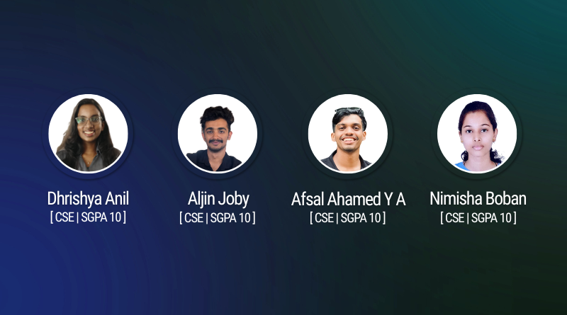 Raising the bar of academic excellence, 4 students (Dhrishya Anil, Aljin Joby,Afsal Ahamed Y A and Nimisha Boban) secured an impeccable 10 SGPA |