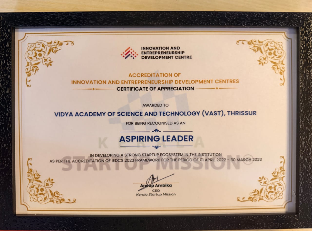 With immense happy and honor, the Editorial Team of News & Events shares that,Innovation and Entrepreneurship Development Centre (IEDC) at Vidya was awarded a certificate of appreciation with title “Aspiring Leader” by the Kerala Startup Mission for its outstanding contribution towards building a strong startup ecosystem within the institution.