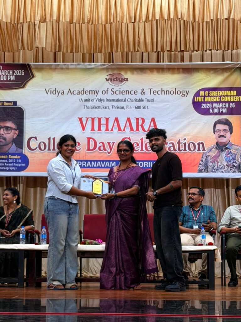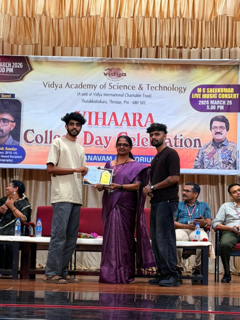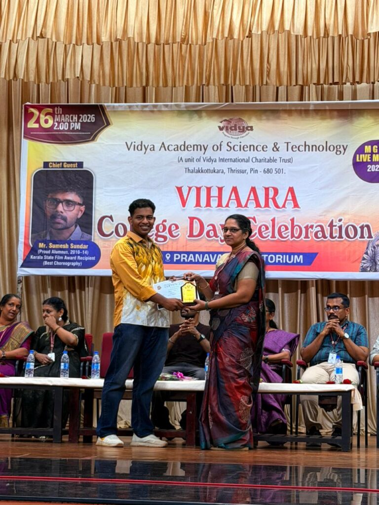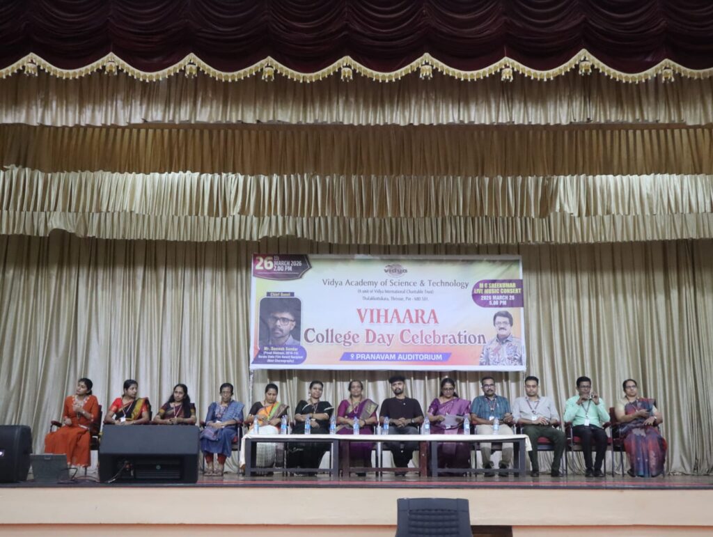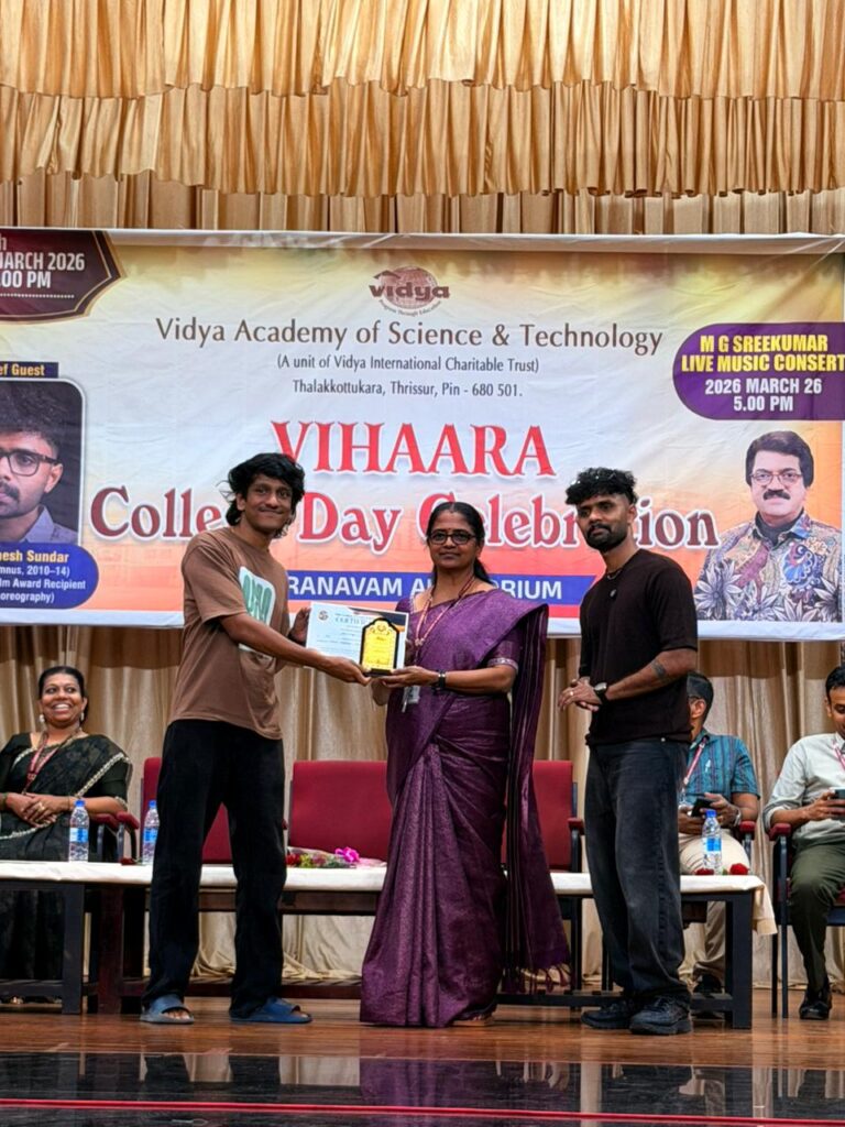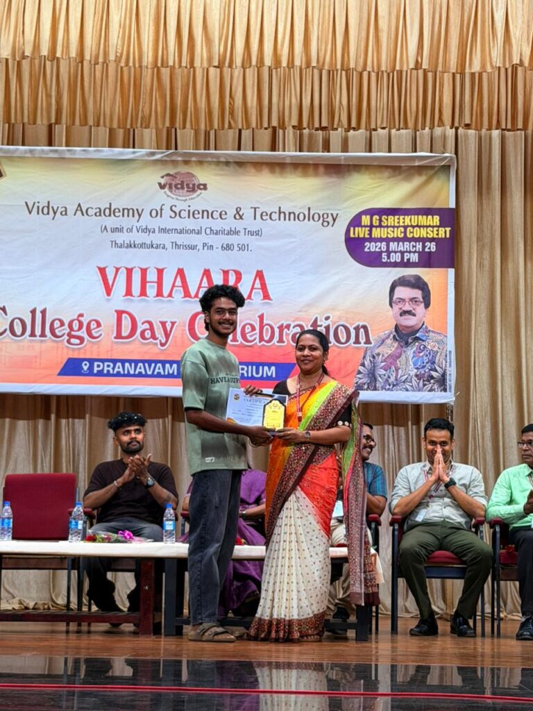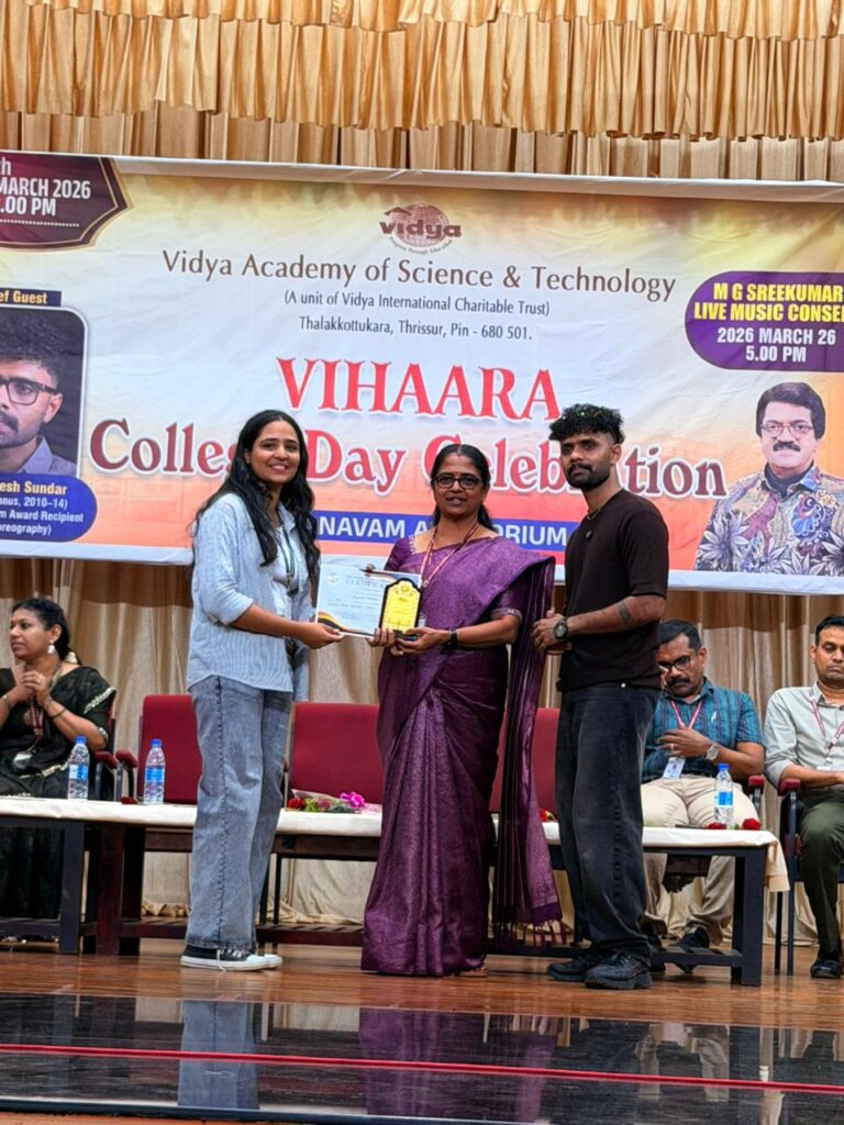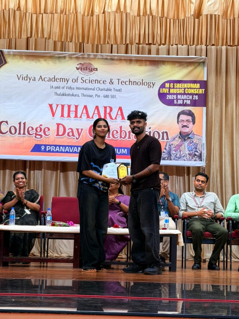 The College Day celebration, VIHAARA 2026, at Vidya Academy of Science and Technology on 26 March 2026 unfolded as a spectacular display of talent and unity. Conducted in two phases, the event created a dynamic platform where students and faculty came together to celebrate creativity, culture, and togetherness in an energetic and festive environment.The festivities commenced with impressive performances by students from various departments. The AI & ML Department opened the cultural segment with innovation and energy, followed by the Civil Engineering Department, which demonstrated creativity and delivered a vibrant performance. The Mechanical Engineering Department showcased precision and talent, while the Electrical & Electronics Engineering Department concluded the first set with flair and enthusiasm