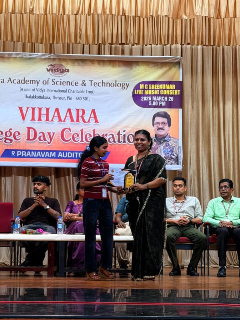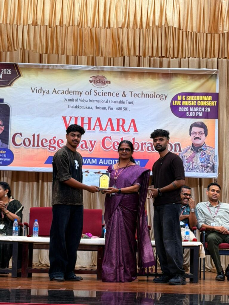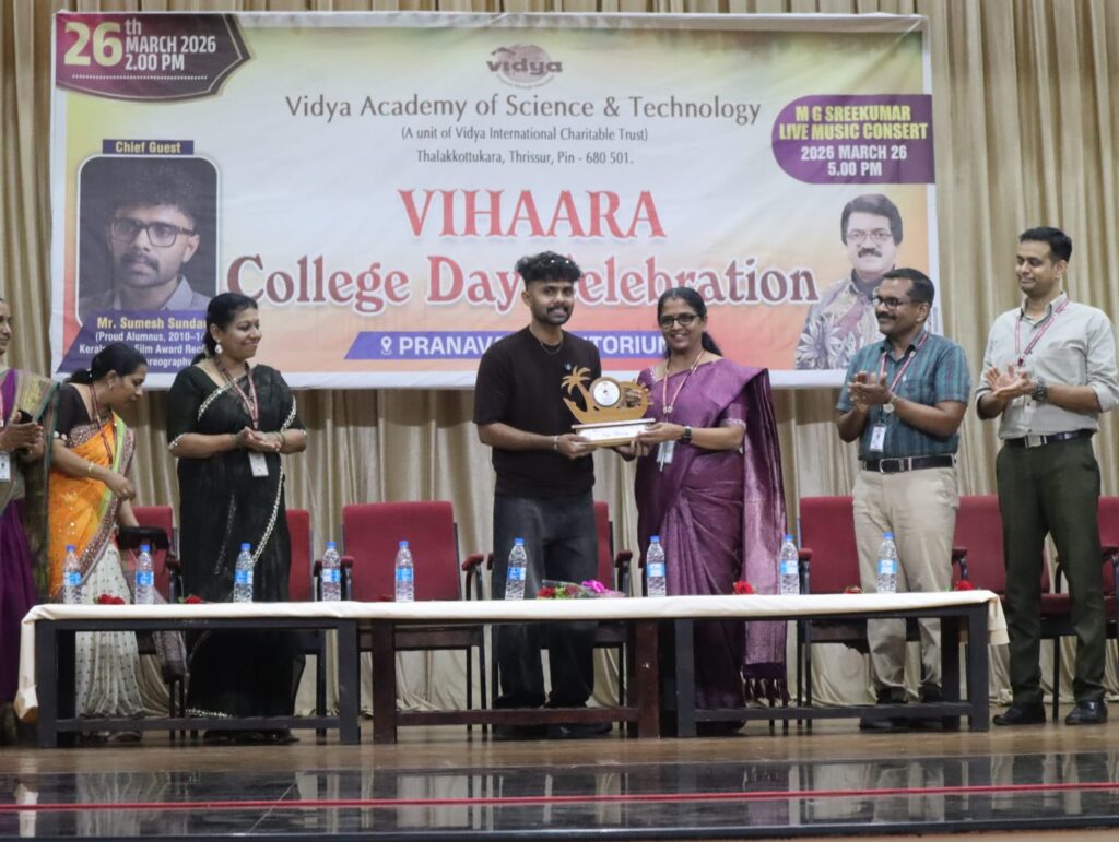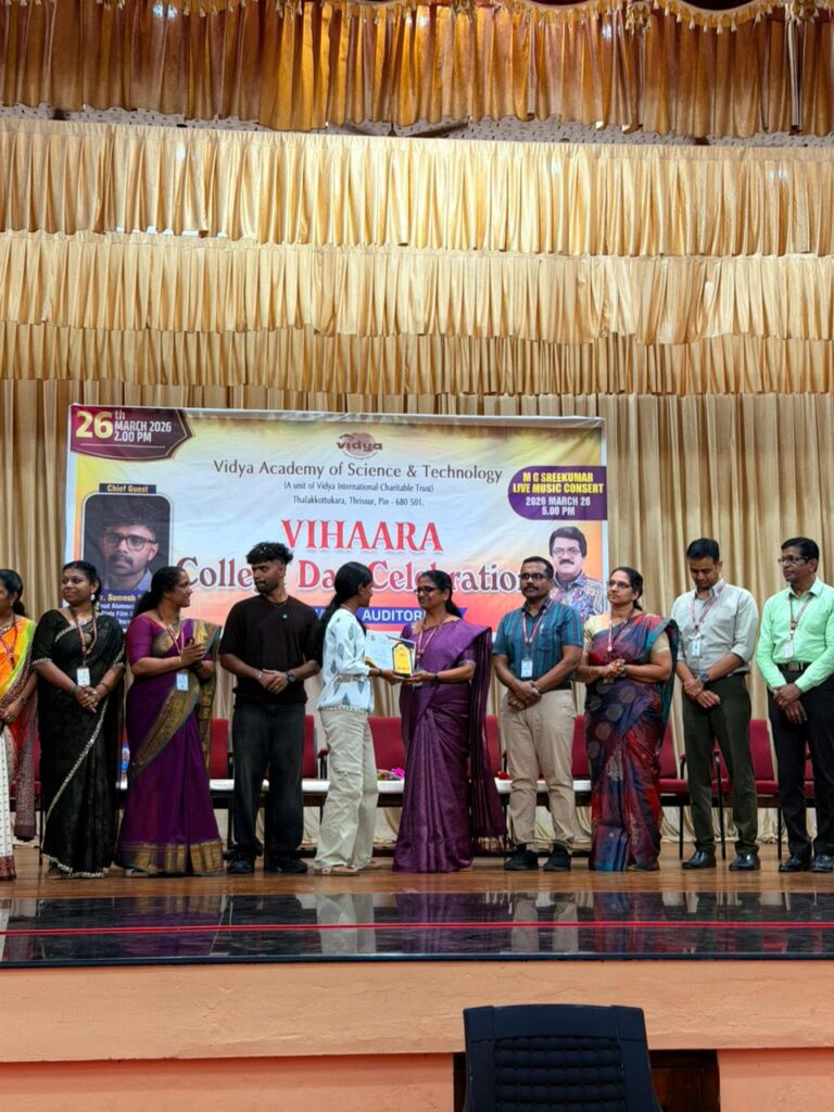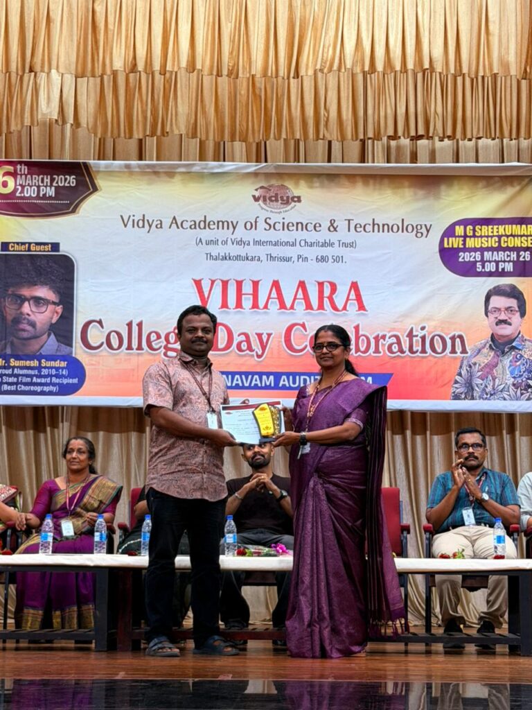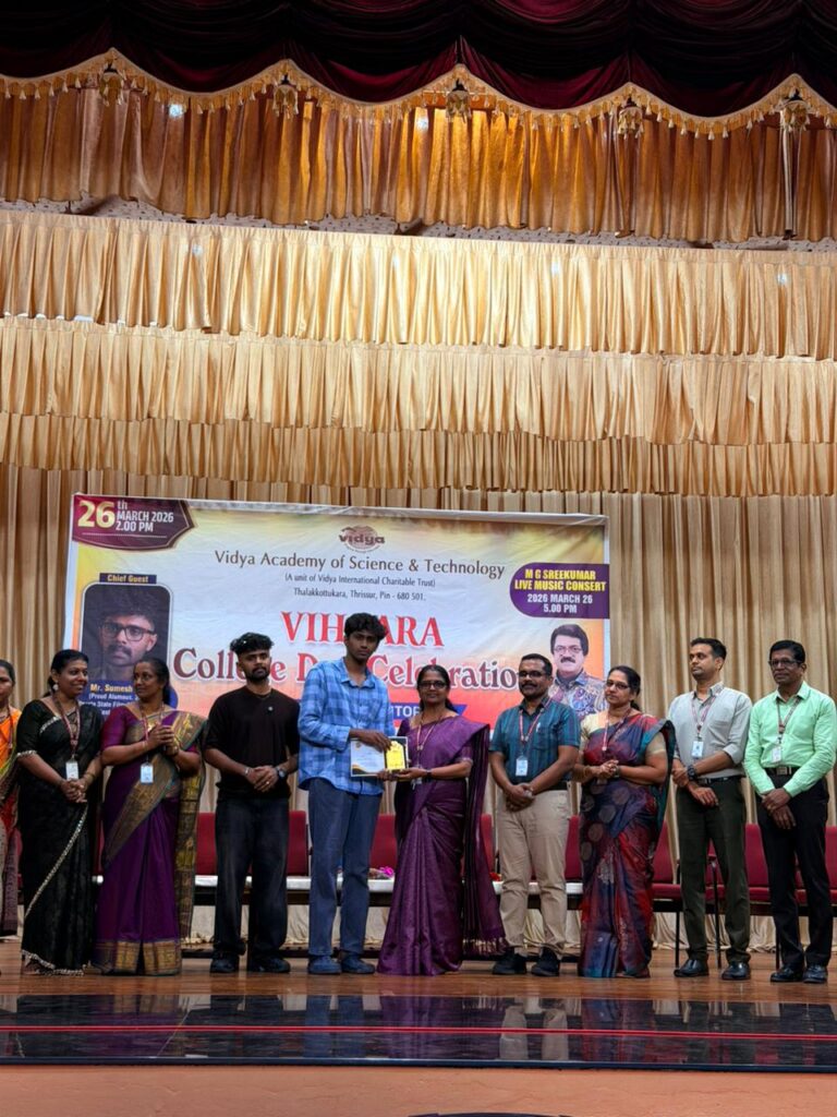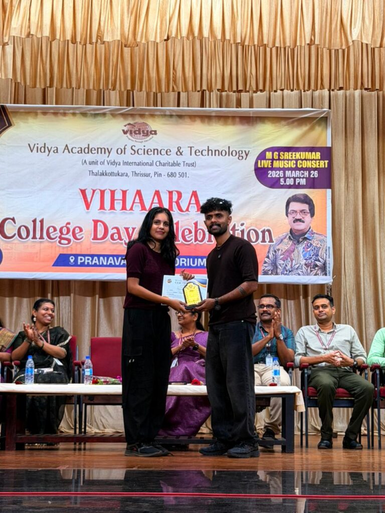 The College Day celebration, VIHAARA 2026, at Vidya Academy of Science and Technology on 26 March 2026 unfolded as a spectacular display of talent and unity. Conducted in two phases, the event created a dynamic platform where students and faculty came together to celebrate creativity, culture, and togetherness in an energetic and festive environment.The festivities commenced with impressive performances by students from various departments. The AI & ML Department opened the cultural segment with innovation and energy, followed by the Civil Engineering Department, which demonstrated creativity and delivered a vibrant performance. The Mechanical Engineering Department showcased precision and talent, while the Electrical & Electronics Engineering Department concluded the first set with flair and enthusiasm