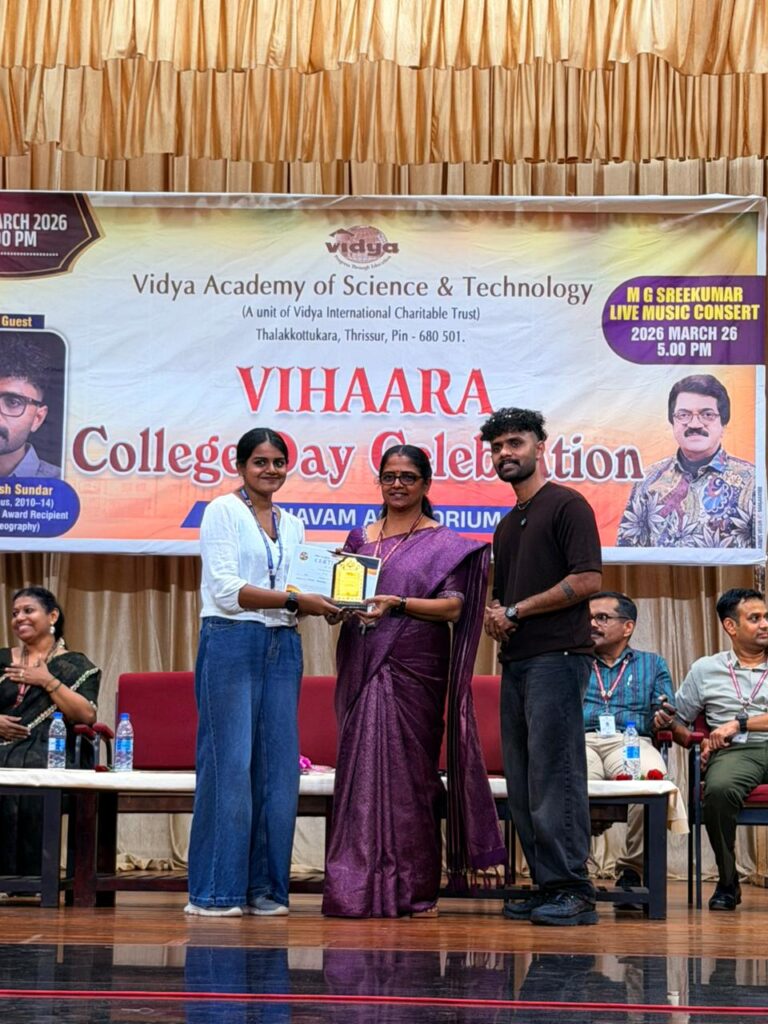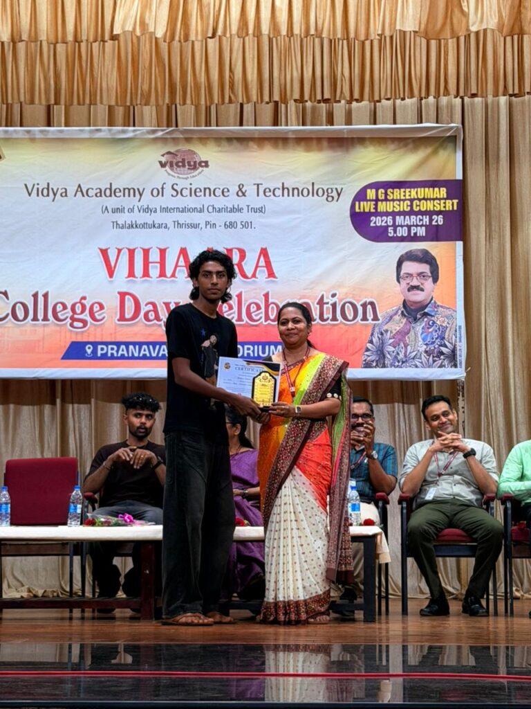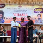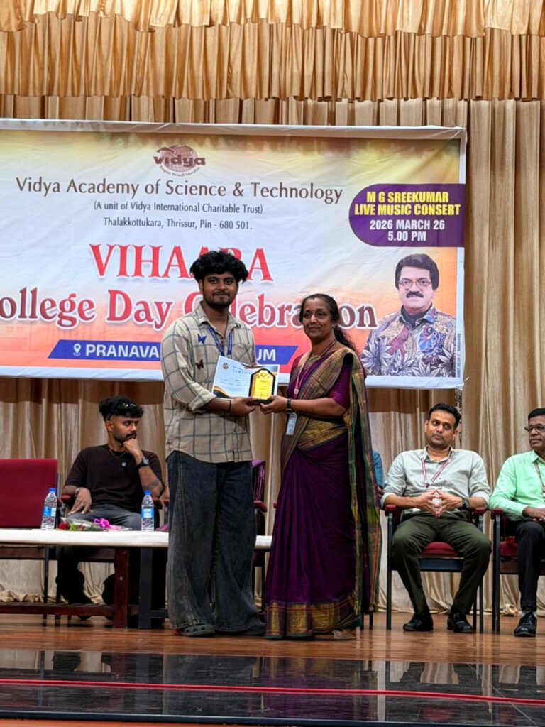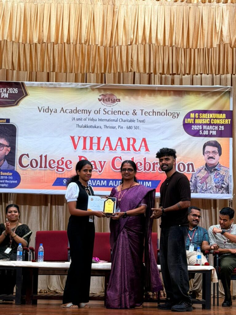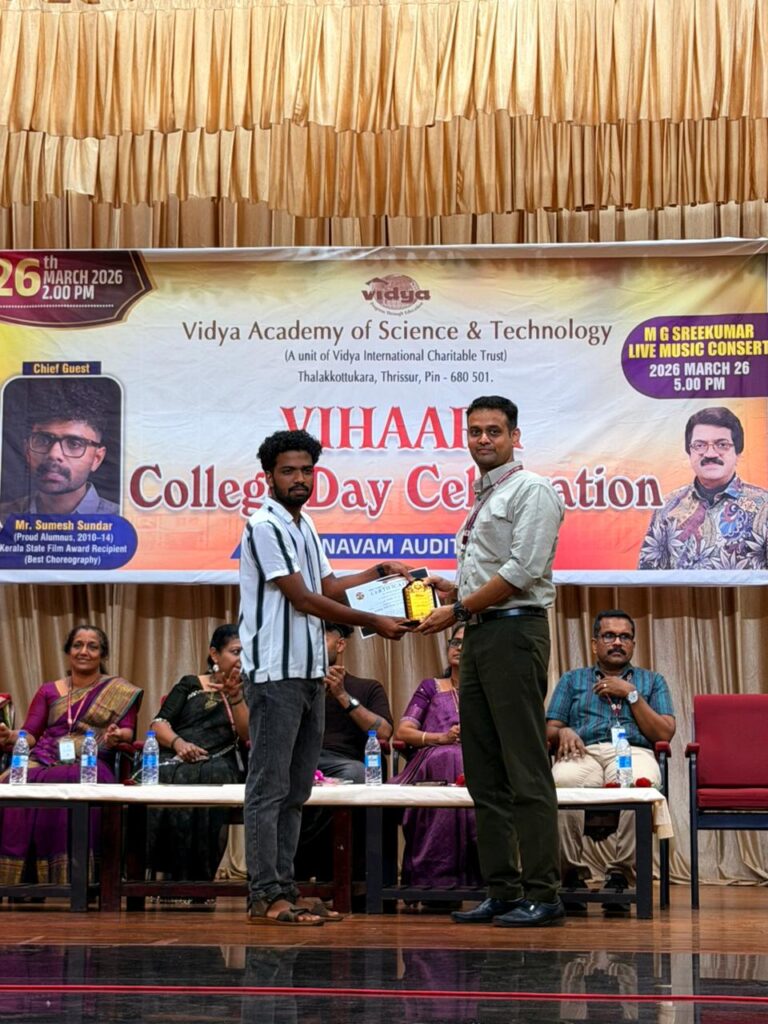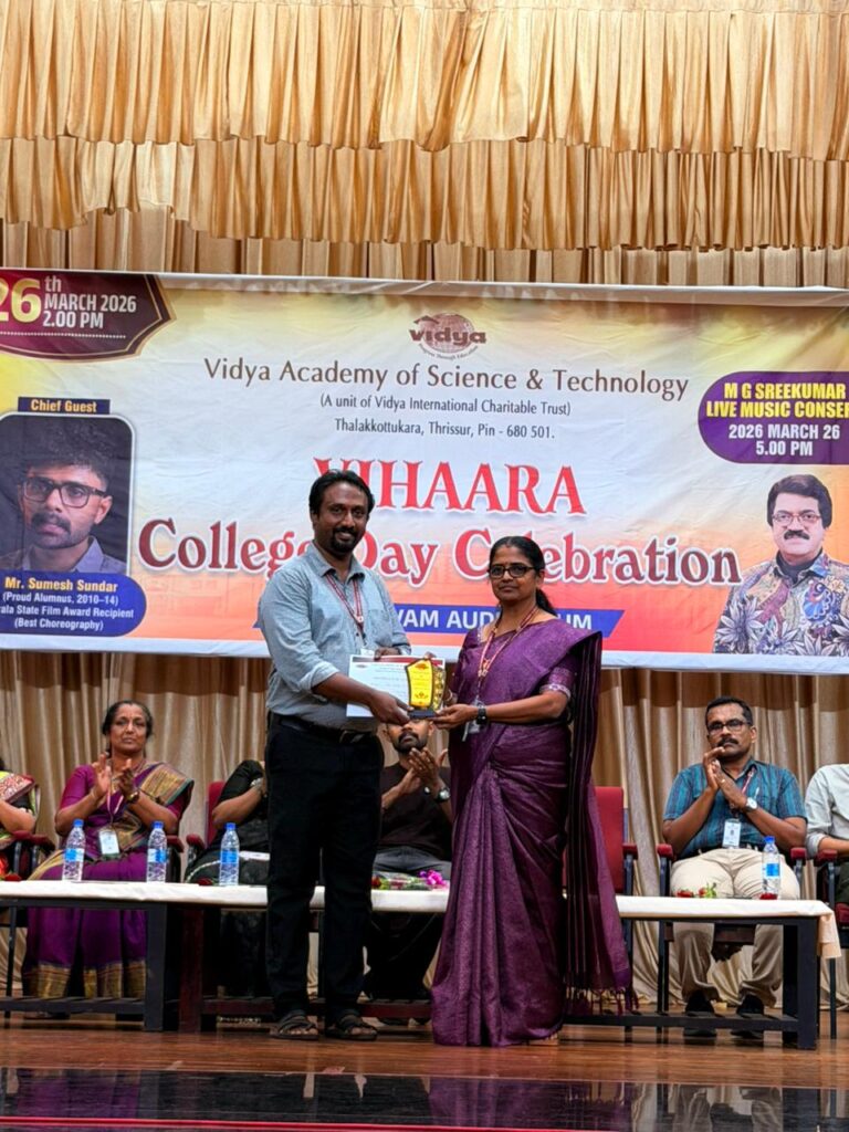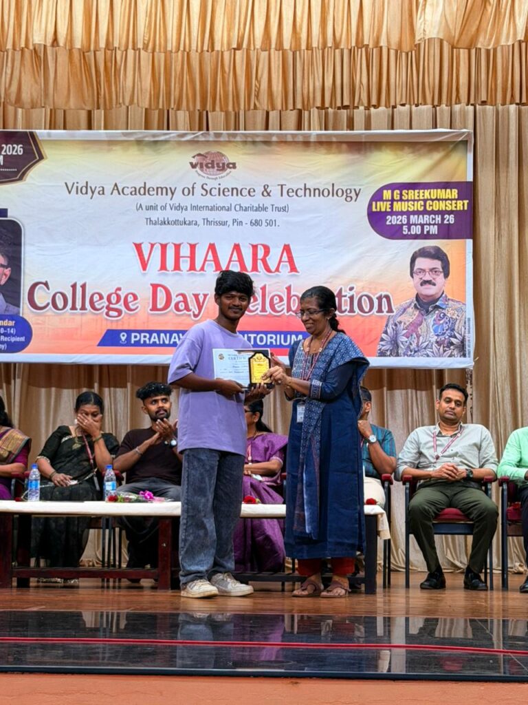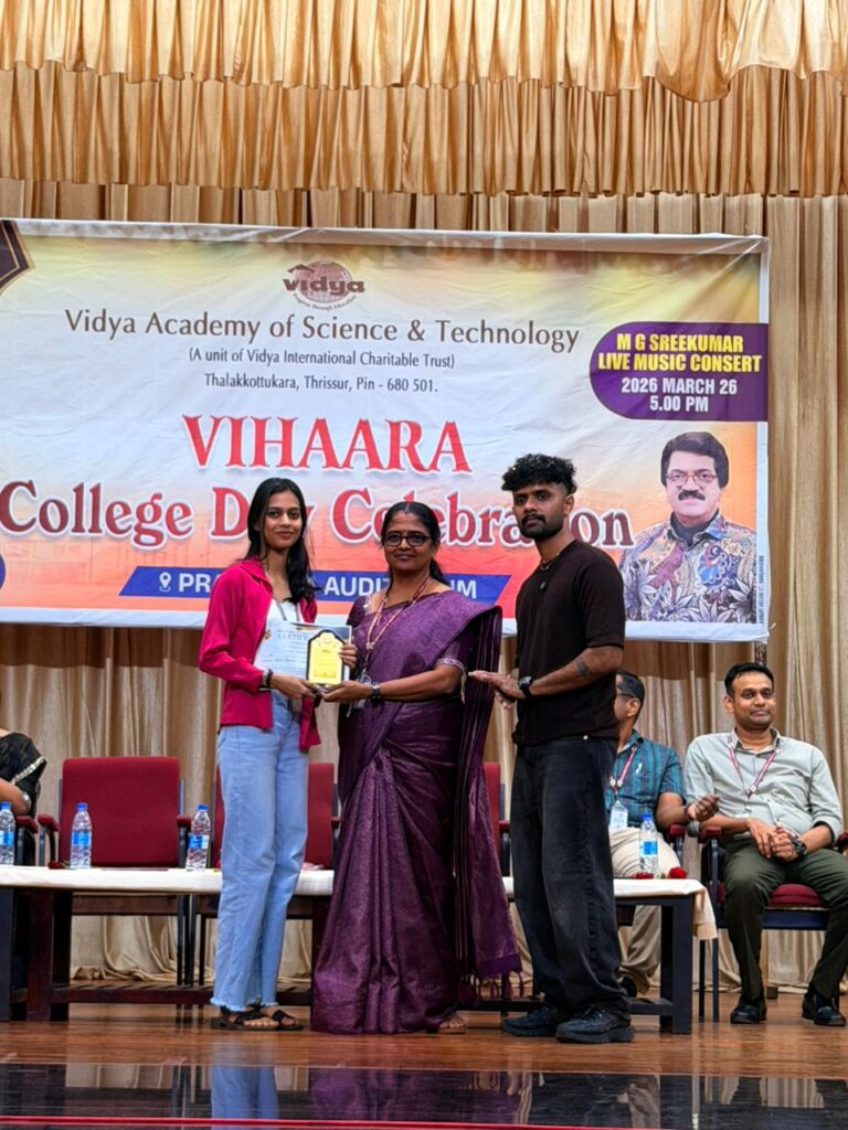 The College Day celebration, VIHAARA 2026, at Vidya Academy of Science and Technology on 26 March 2026 unfolded as a spectacular display of talent and unity. Conducted in two phases, the event created a dynamic platform where students and faculty came together to celebrate creativity, culture, and togetherness in an energetic and festive environment.The festivities commenced with impressive performances by students from various departments. The AI & ML Department opened the cultural segment with innovation and energy, followed by the Civil Engineering Department, which demonstrated creativity and delivered a vibrant performance. The Mechanical Engineering Department showcased precision and talent, while the Electrical & Electronics Engineering Department concluded the first set with flair and enthusiasm