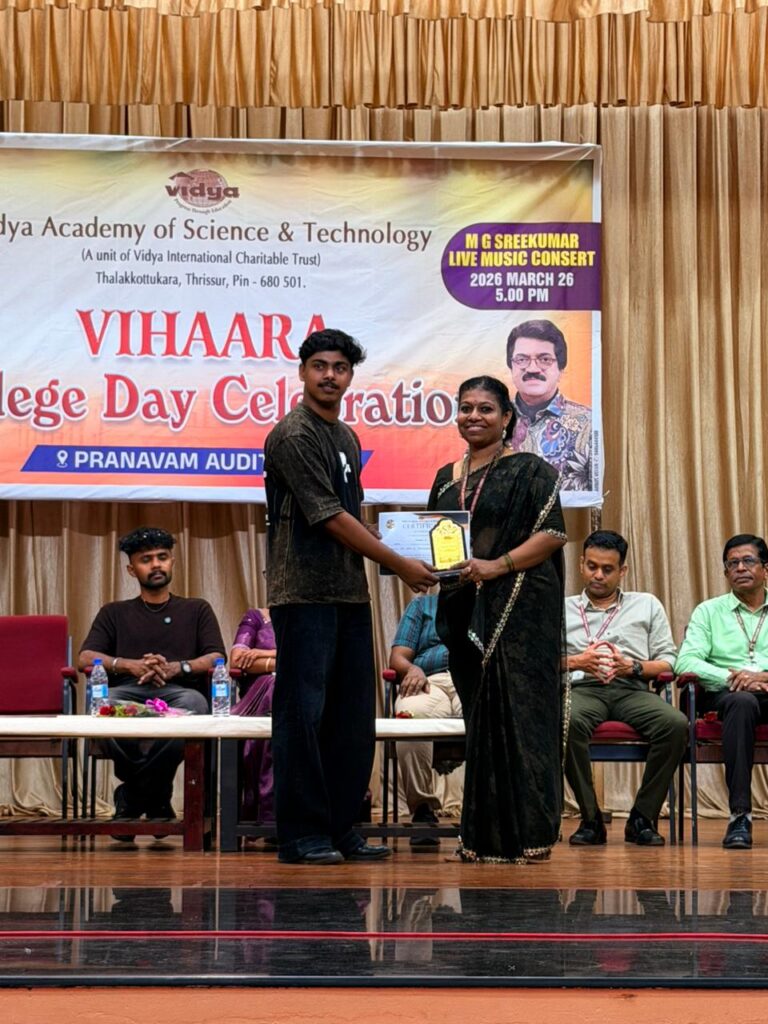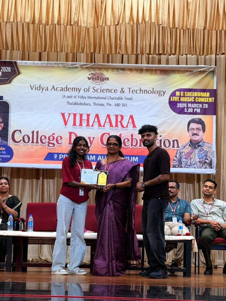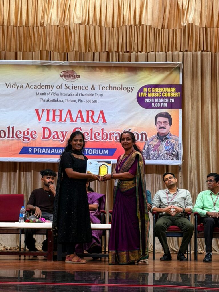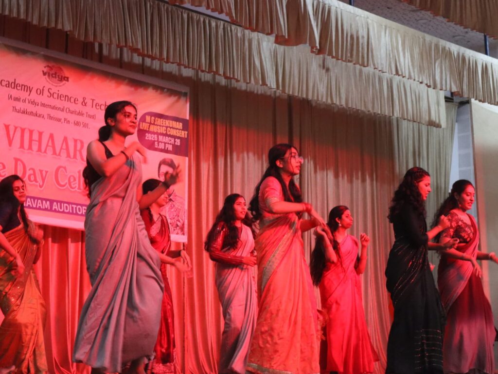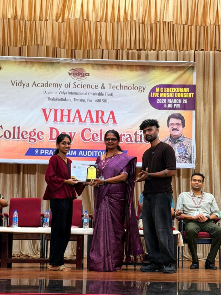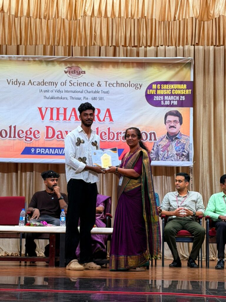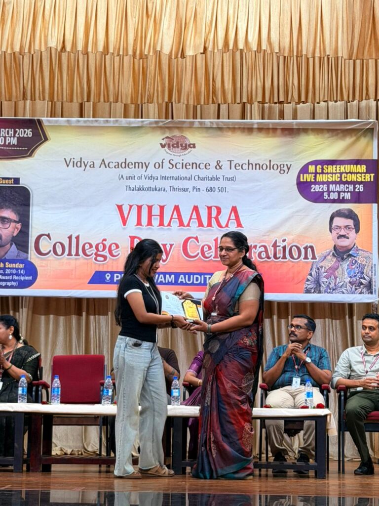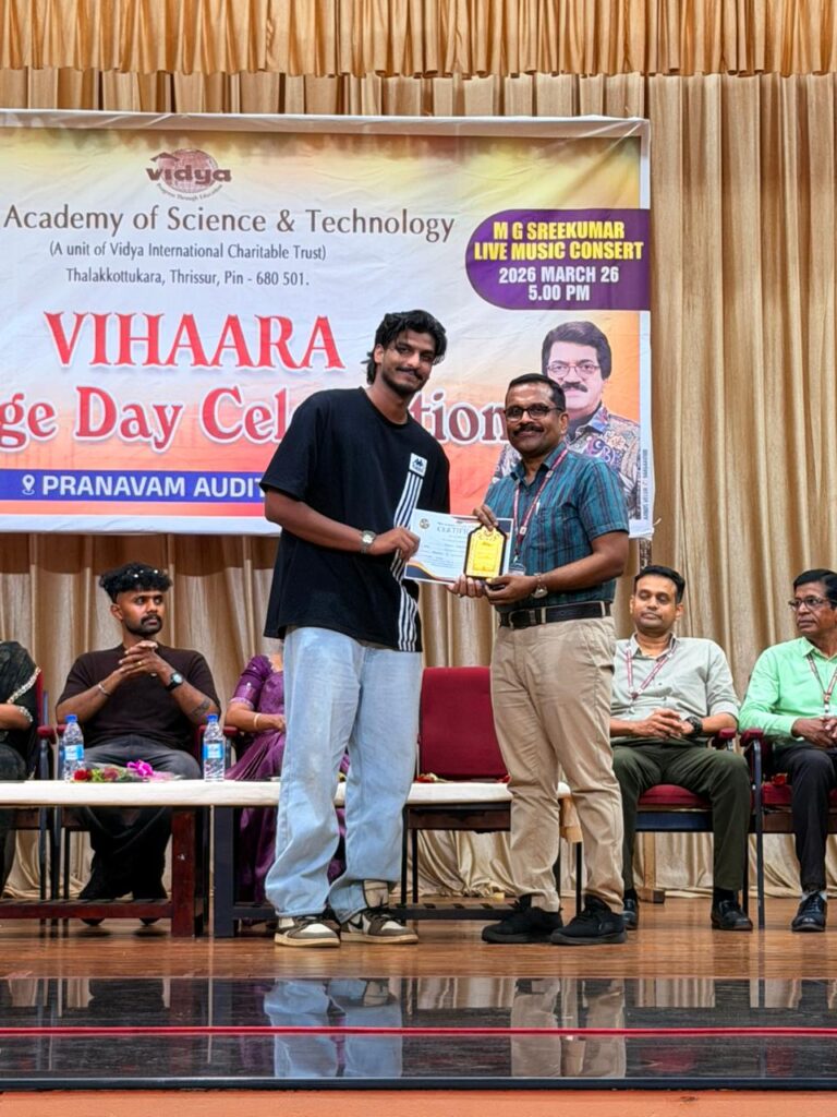 The College Day celebration, VIHAARA 2026, at Vidya Academy of Science and Technology on 26 March 2026 unfolded as a spectacular display of talent and unity. Conducted in two phases, the event created a dynamic platform where students and faculty came together to celebrate creativity, culture, and togetherness in an energetic and festive environment.The festivities commenced with impressive performances by students from various departments. The AI & ML Department opened the cultural segment with innovation and energy, followed by the Civil Engineering Department, which demonstrated creativity and delivered a vibrant performance. The Mechanical Engineering Department showcased precision and talent, while the Electrical & Electronics Engineering Department concluded the first set with flair and enthusiasm
