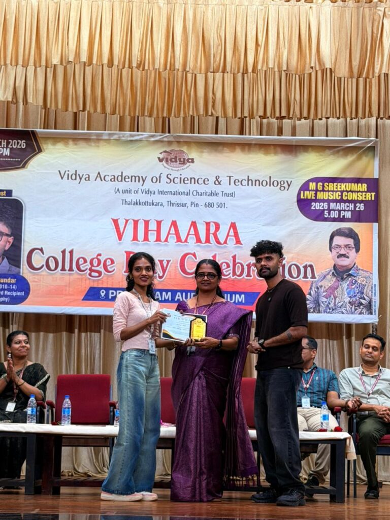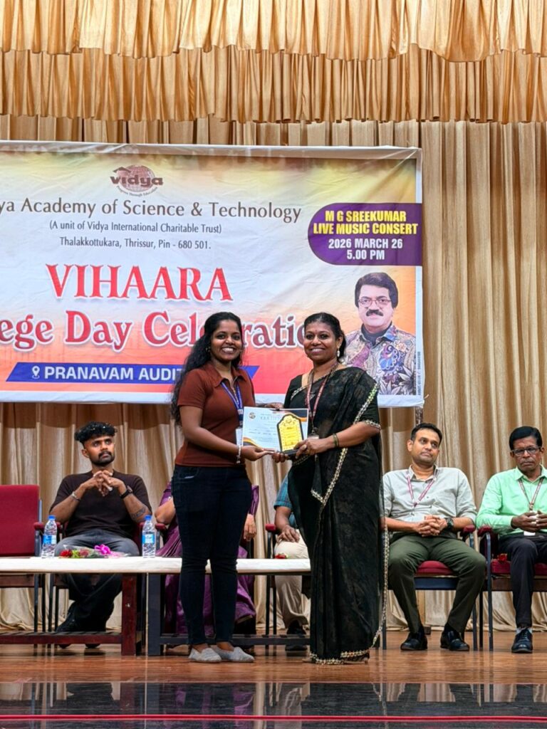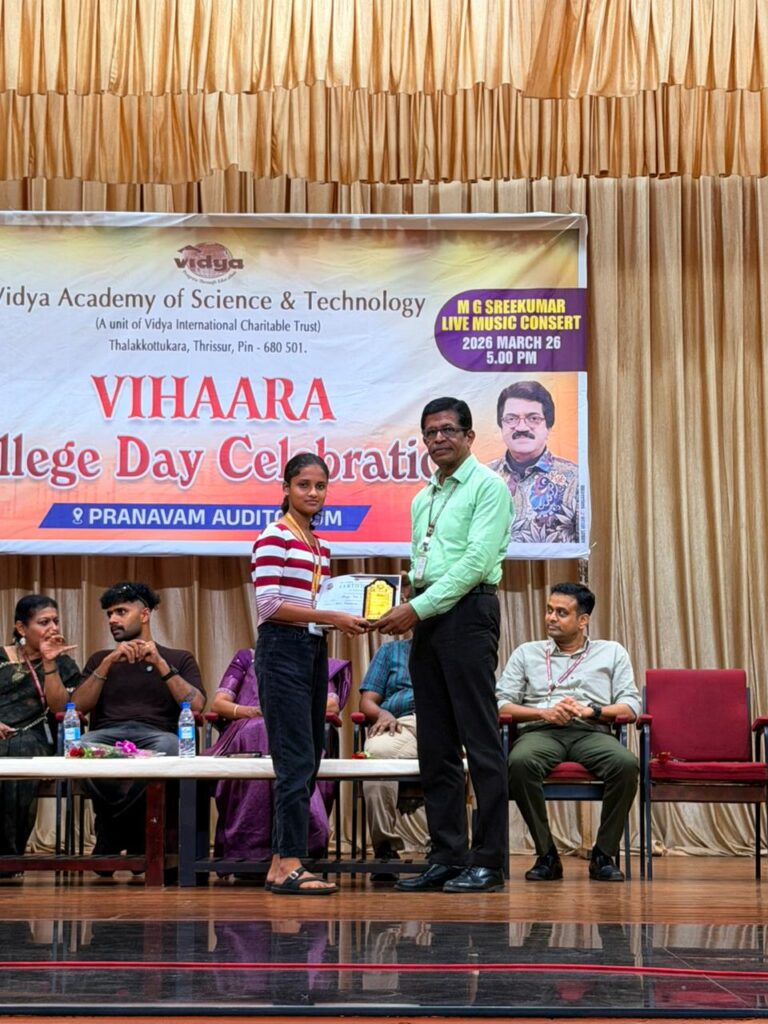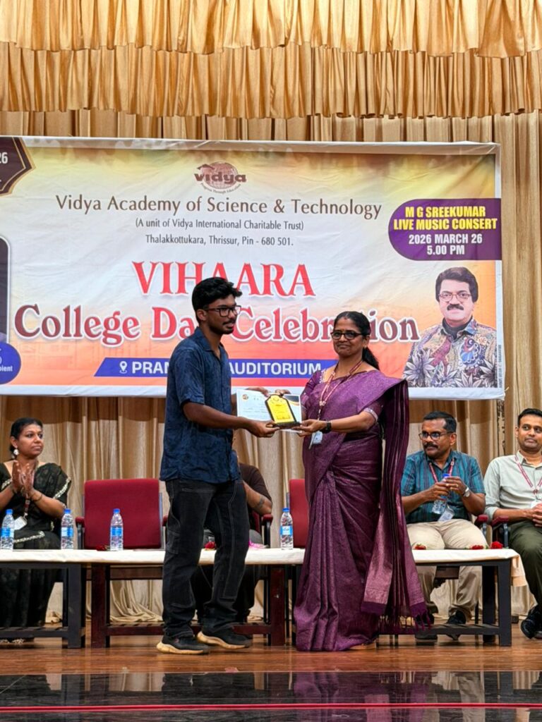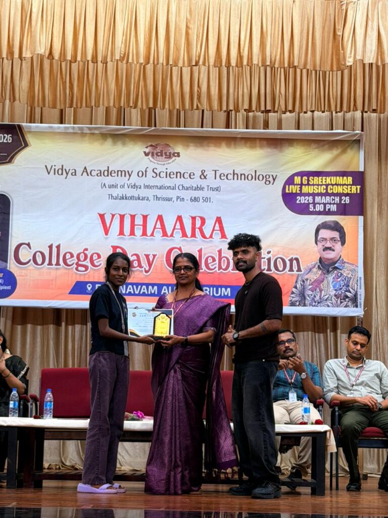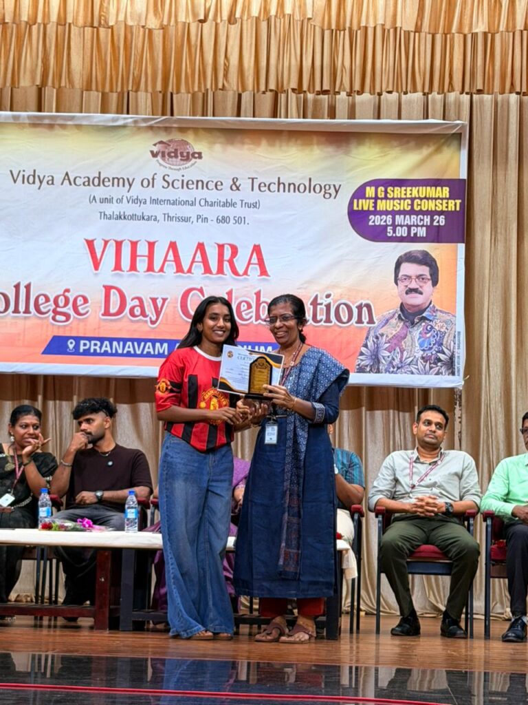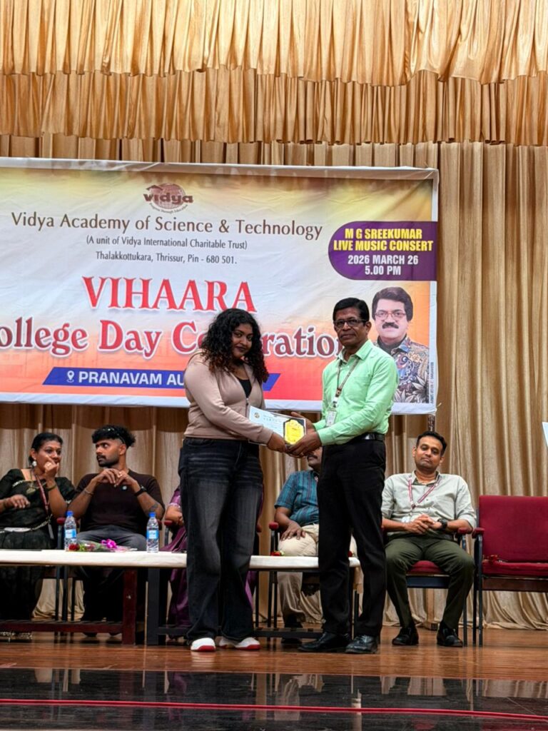 The College Day celebration, VIHAARA 2026, at Vidya Academy of Science and Technology on 26 March 2026 unfolded as a spectacular display of talent and unity. Conducted in two phases, the event created a dynamic platform where students and faculty came together to celebrate creativity, culture, and togetherness in an energetic and festive environment.The festivities commenced with impressive performances by students from various departments. The AI & ML Department opened the cultural segment with innovation and energy, followed by the Civil Engineering Department, which demonstrated creativity and delivered a vibrant performance. The Mechanical Engineering Department showcased precision and talent, while the Electrical & Electronics Engineering Department concluded the first set with flair and enthusiasm