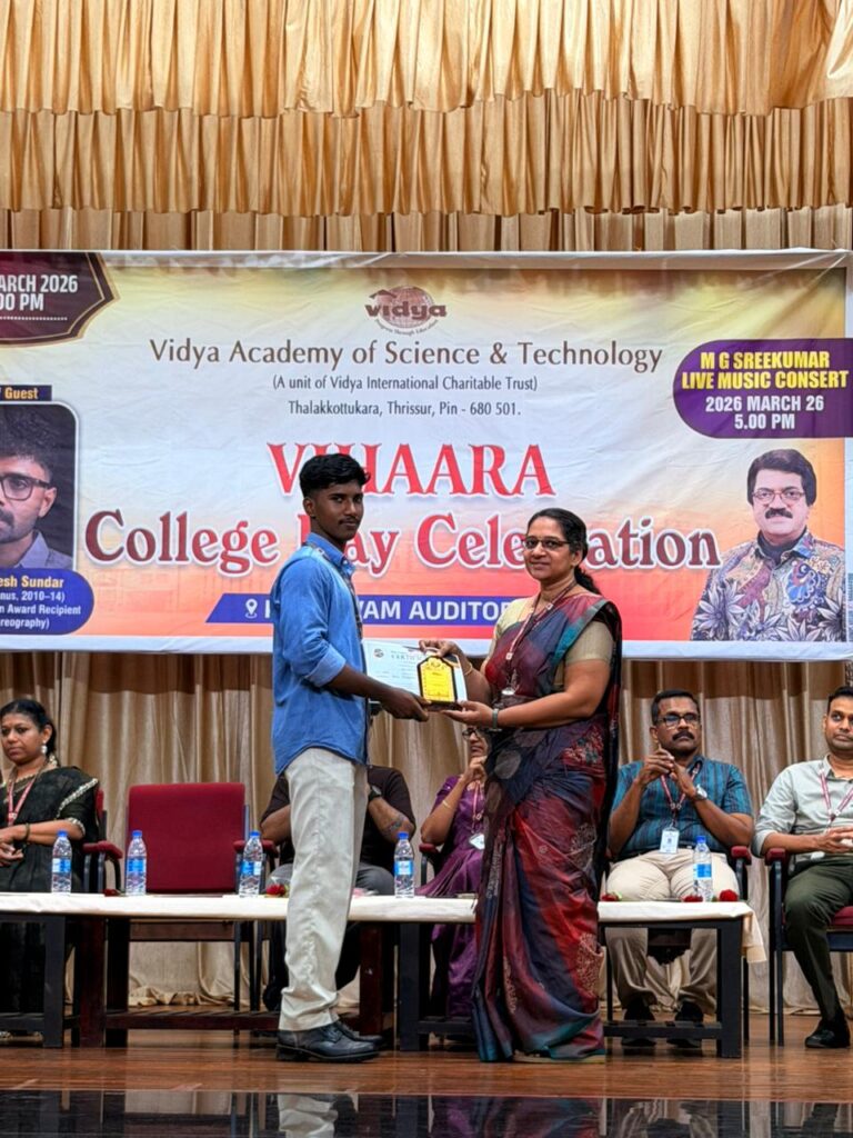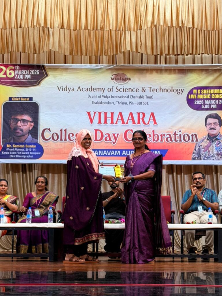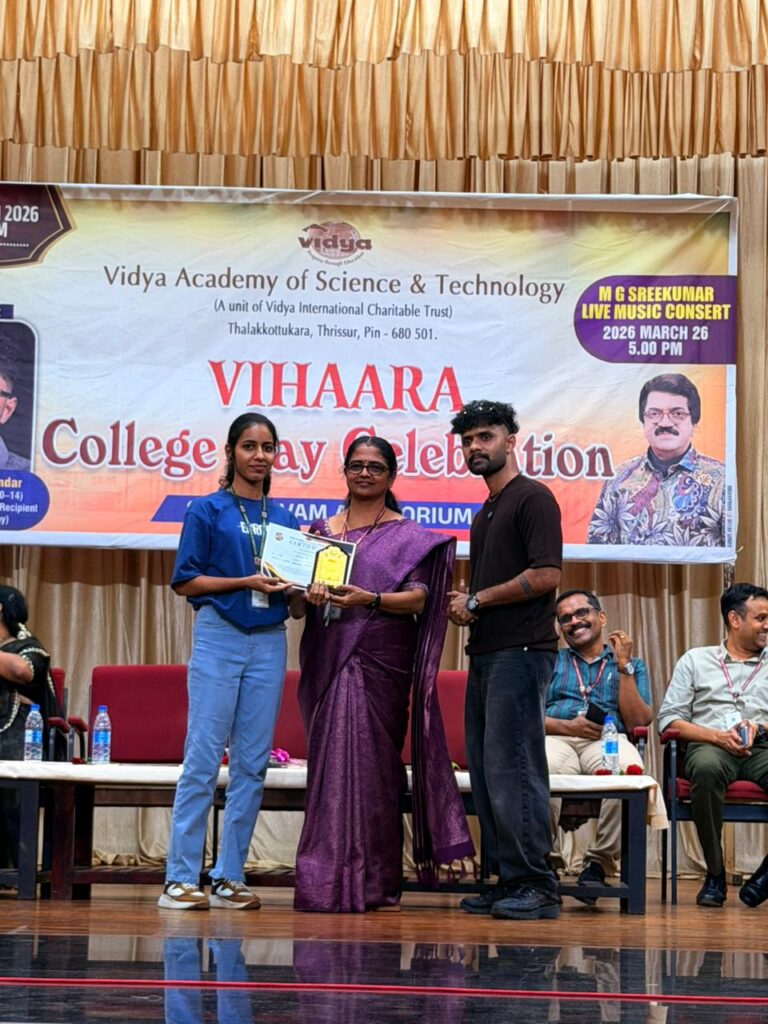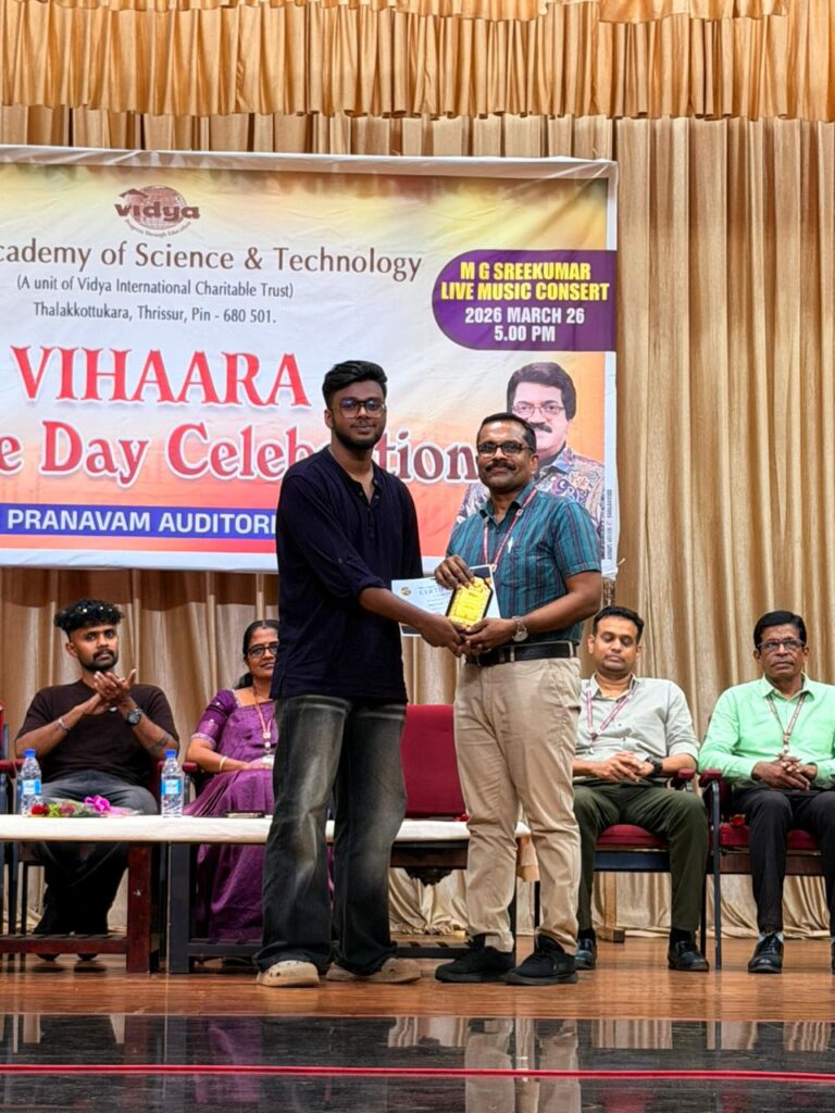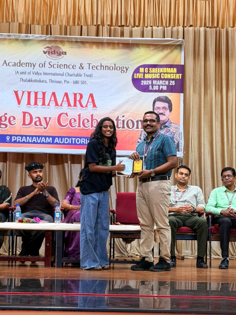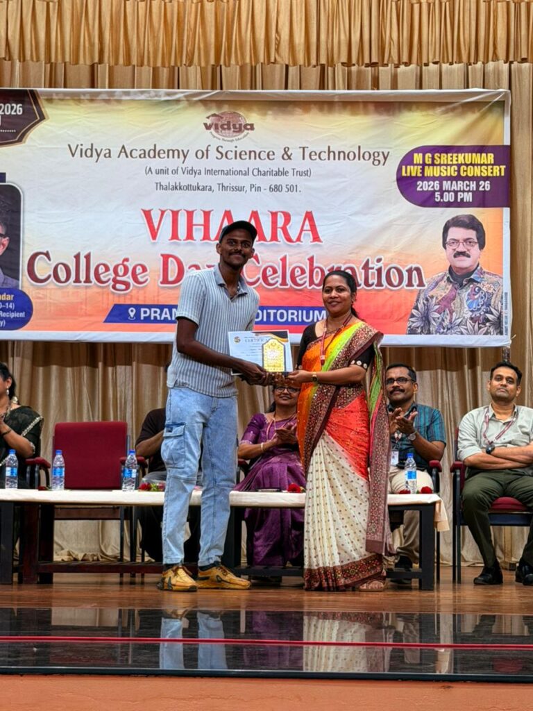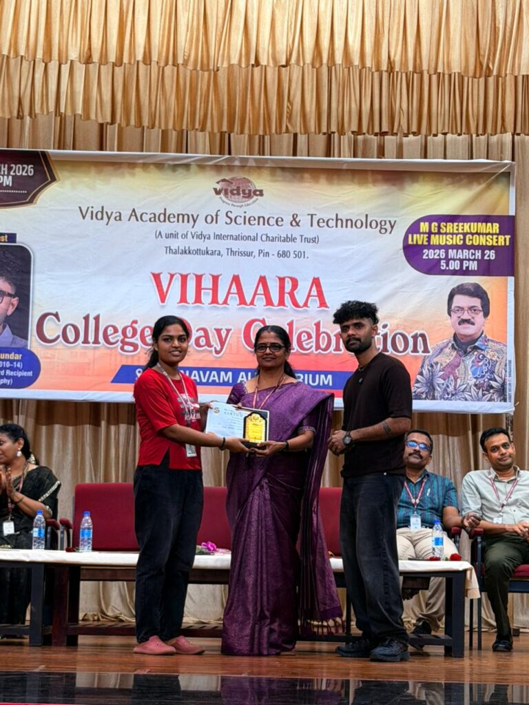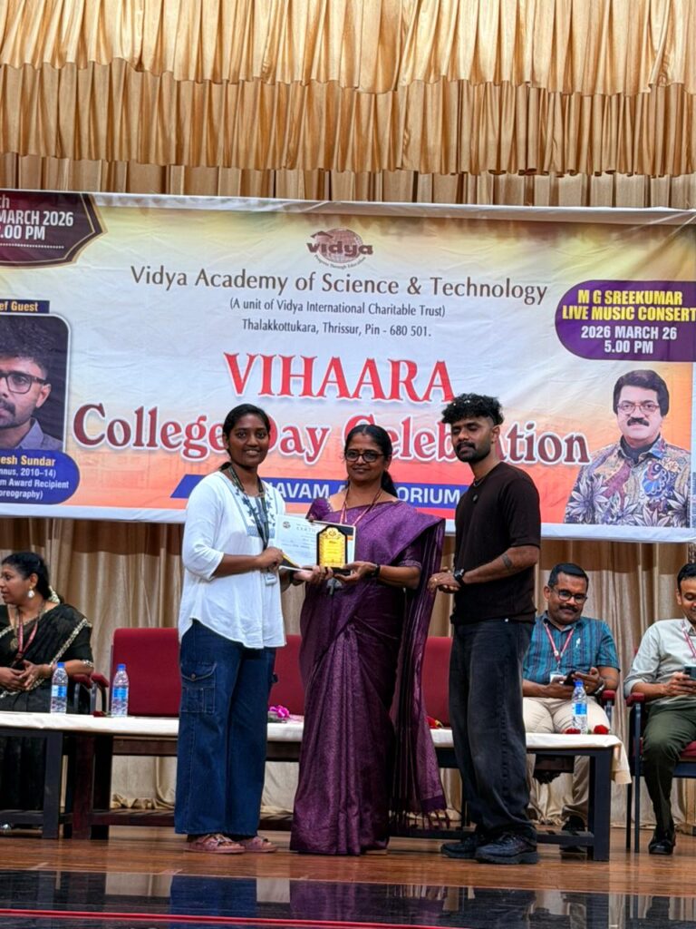 The College Day celebration, VIHAARA 2026, at Vidya Academy of Science and Technology on 26 March 2026 unfolded as a spectacular display of talent and unity. Conducted in two phases, the event created a dynamic platform where students and faculty came together to celebrate creativity, culture, and togetherness in an energetic and festive environment.The festivities commenced with impressive performances by students from various departments. The AI & ML Department opened the cultural segment with innovation and energy, followed by the Civil Engineering Department, which demonstrated creativity and delivered a vibrant performance. The Mechanical Engineering Department showcased precision and talent, while the Electrical & Electronics Engineering Department concluded the first set with flair and enthusiasm