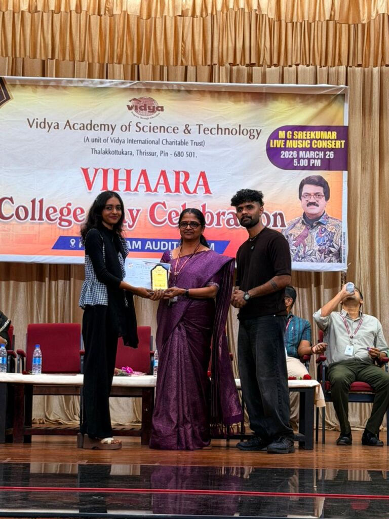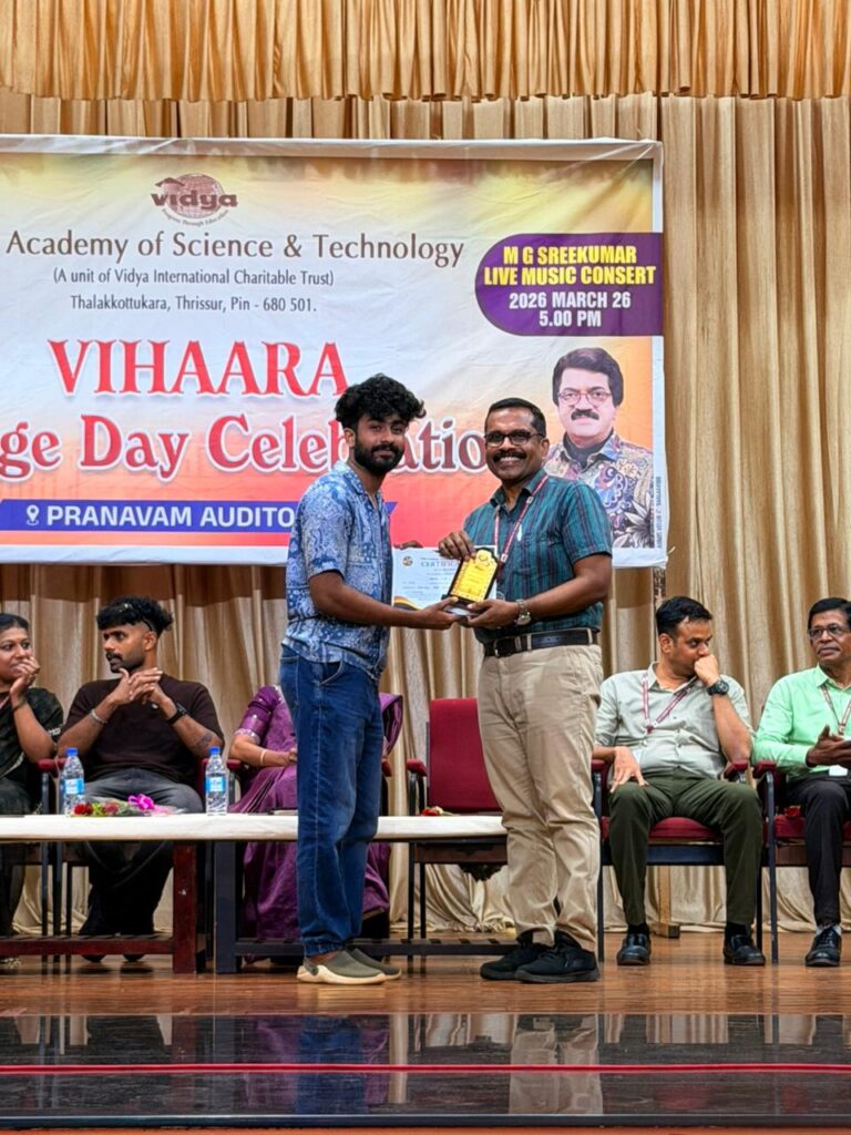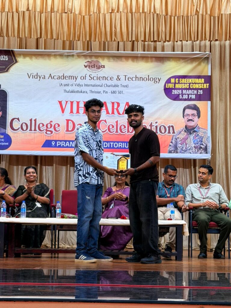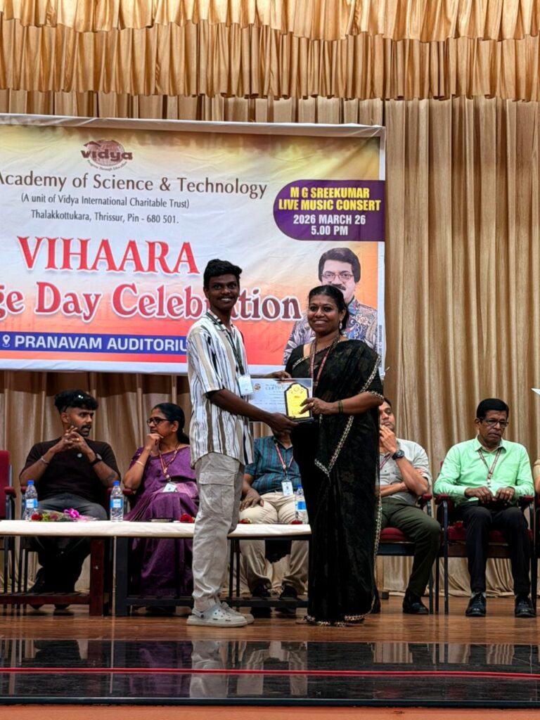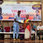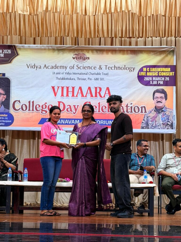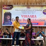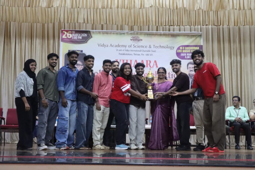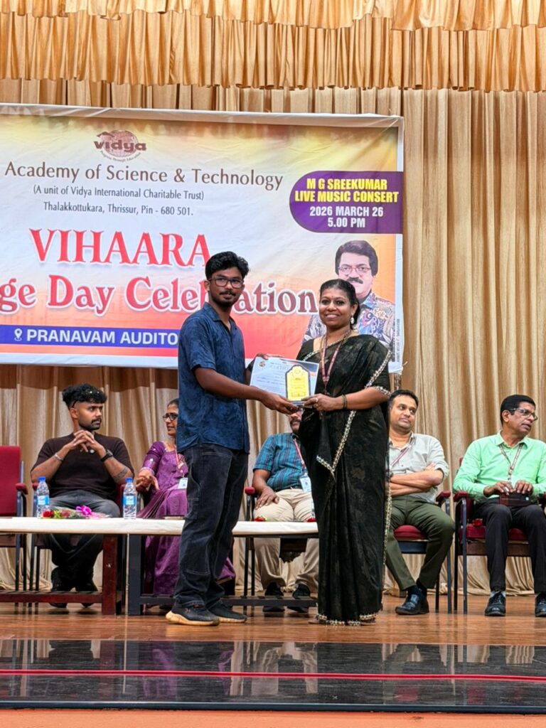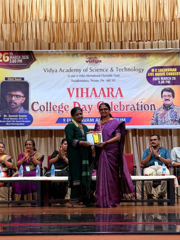 The College Day celebration, VIHAARA 2026, at Vidya Academy of Science and Technology on 26 March 2026 unfolded as a spectacular display of talent and unity. Conducted in two phases, the event created a dynamic platform where students and faculty came together to celebrate creativity, culture, and togetherness in an energetic and festive environment.The festivities commenced with impressive performances by students from various departments. The AI & ML Department opened the cultural segment with innovation and energy, followed by the Civil Engineering Department, which demonstrated creativity and delivered a vibrant performance. The Mechanical Engineering Department showcased precision and talent, while the Electrical & Electronics Engineering Department concluded the first set with flair and enthusiasm