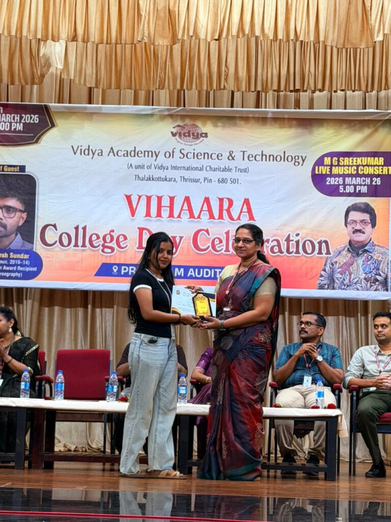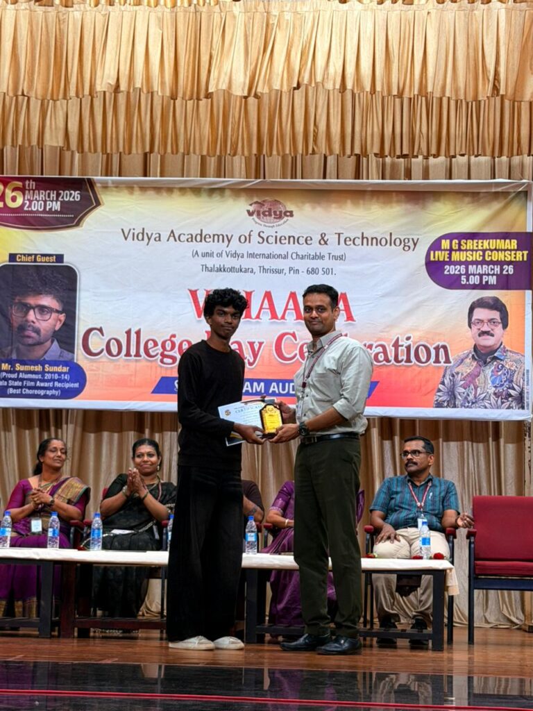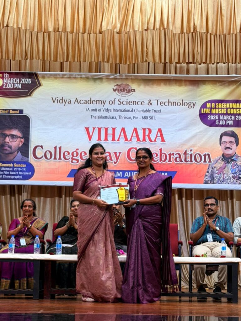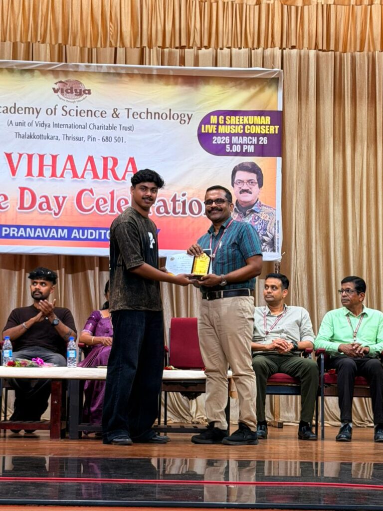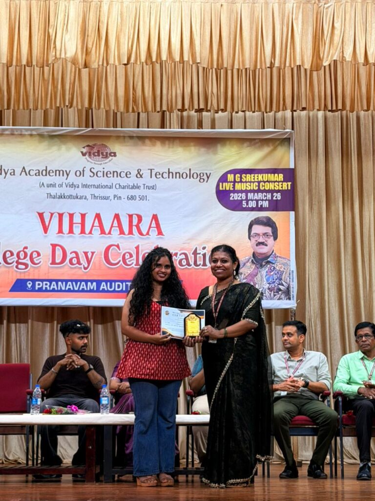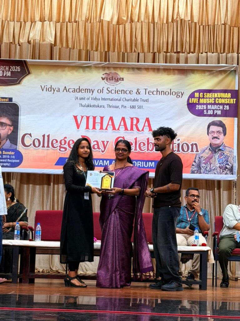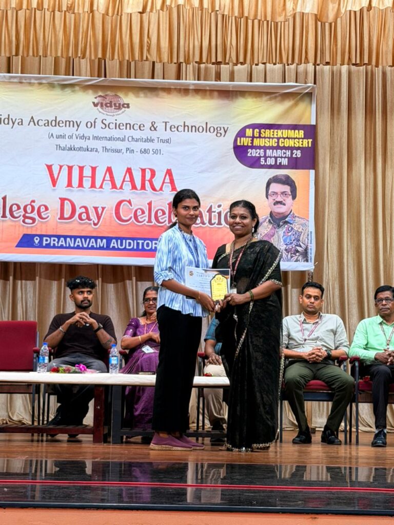 The College Day celebration, VIHAARA 2026, at Vidya Academy of Science and Technology on 26 March 2026 unfolded as a spectacular display of talent and unity. Conducted in two phases, the event created a dynamic platform where students and faculty came together to celebrate creativity, culture, and togetherness in an energetic and festive environment.The festivities commenced with impressive performances by students from various departments. The AI & ML Department opened the cultural segment with innovation and energy, followed by the Civil Engineering Department, which demonstrated creativity and delivered a vibrant performance. The Mechanical Engineering Department showcased precision and talent, while the Electrical & Electronics Engineering Department concluded the first set with flair and enthusiasm