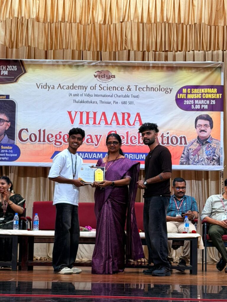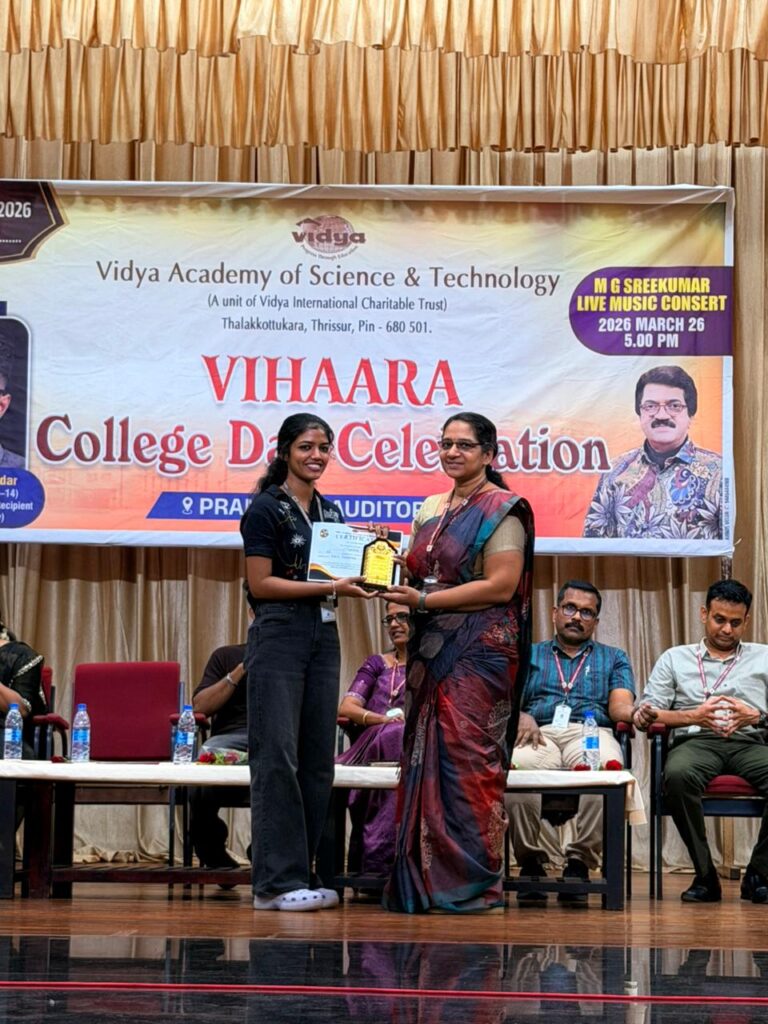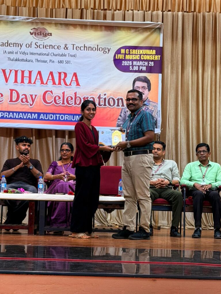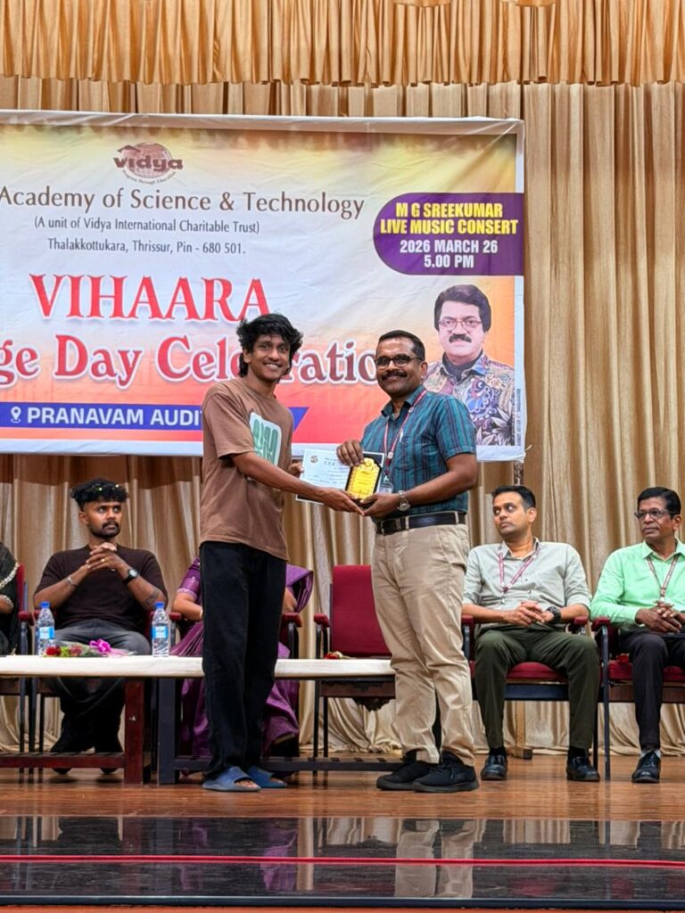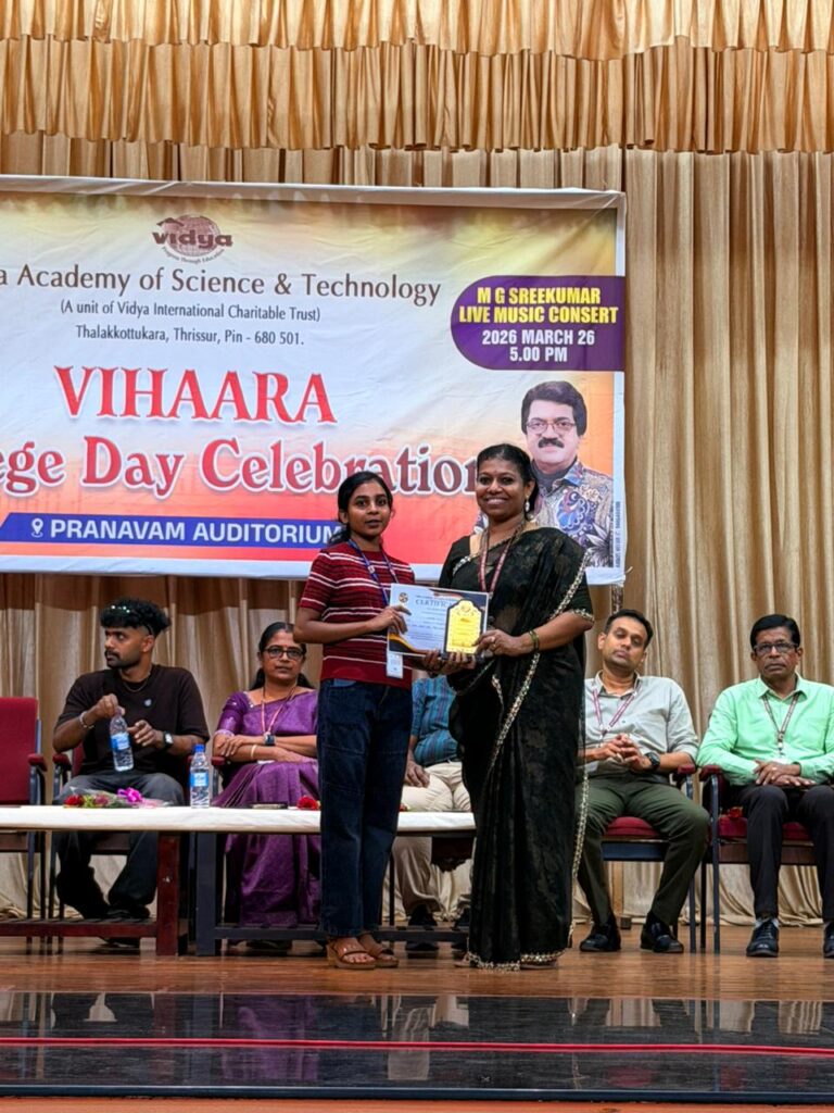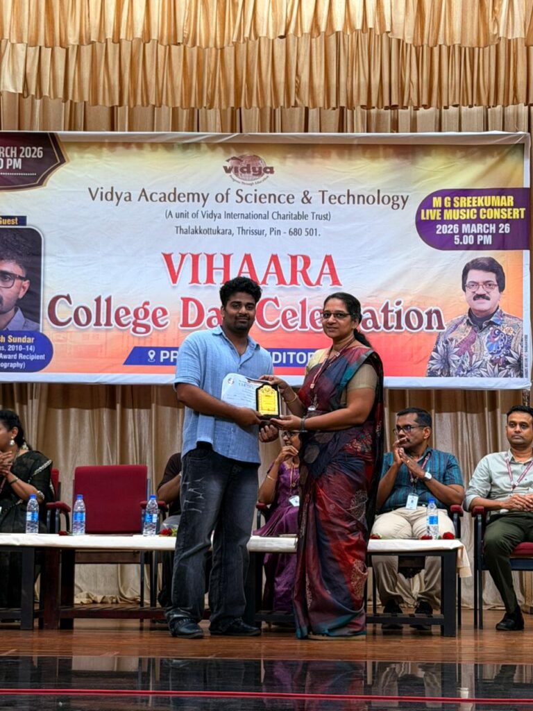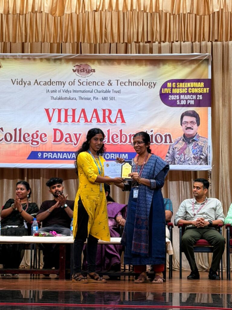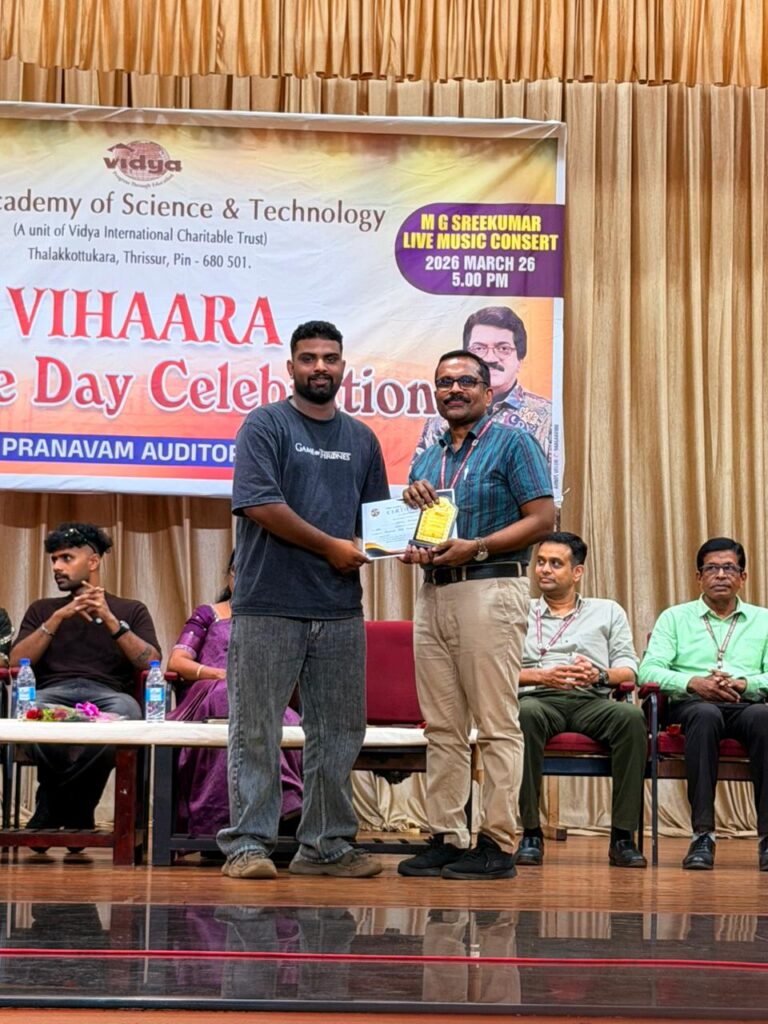 The College Day celebration, VIHAARA 2026, at Vidya Academy of Science and Technology on 26 March 2026 unfolded as a spectacular display of talent and unity. Conducted in two phases, the event created a dynamic platform where students and faculty came together to celebrate creativity, culture, and togetherness in an energetic and festive environment.The festivities commenced with impressive performances by students from various departments. The AI & ML Department opened the cultural segment with innovation and energy, followed by the Civil Engineering Department, which demonstrated creativity and delivered a vibrant performance. The Mechanical Engineering Department showcased precision and talent, while the Electrical & Electronics Engineering Department concluded the first set with flair and enthusiasm