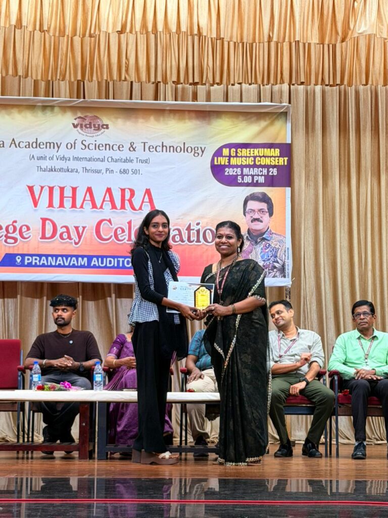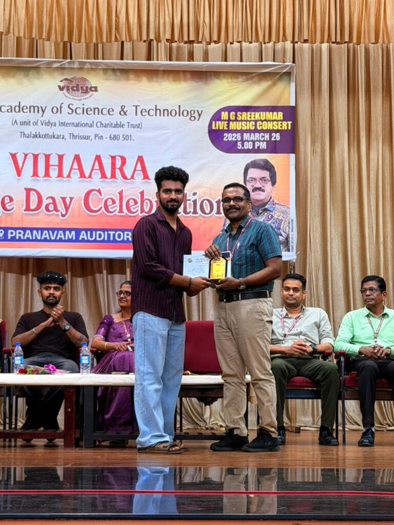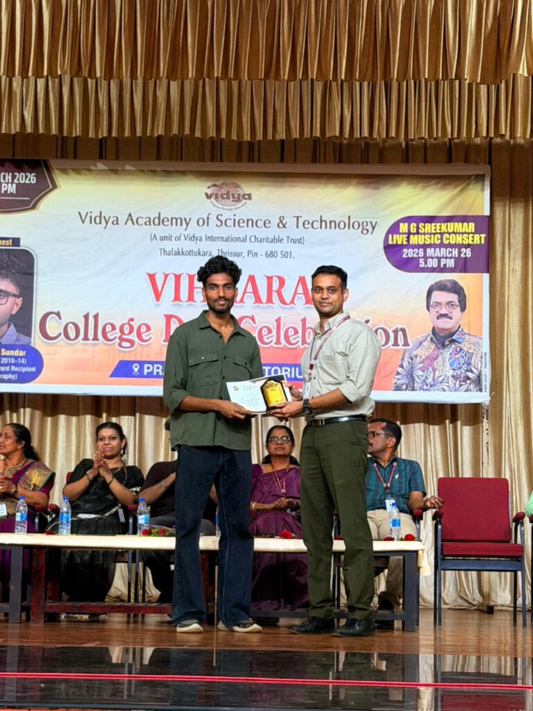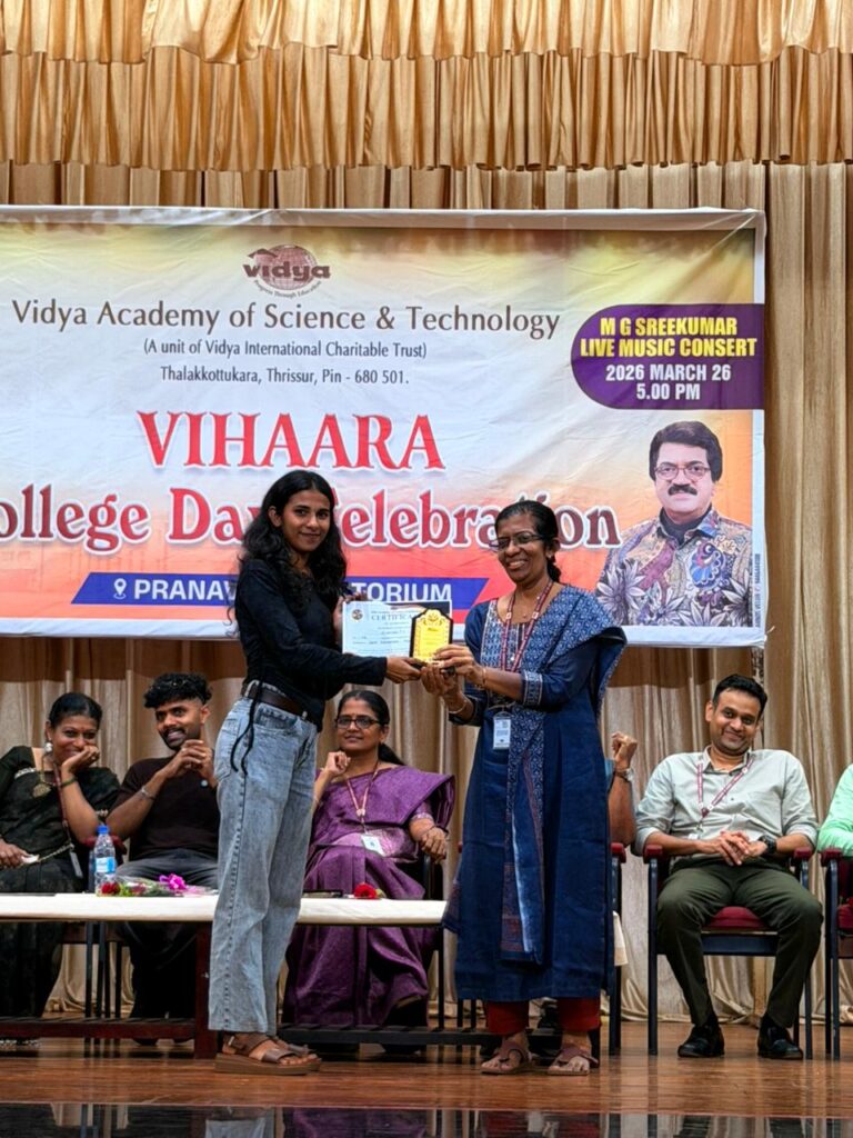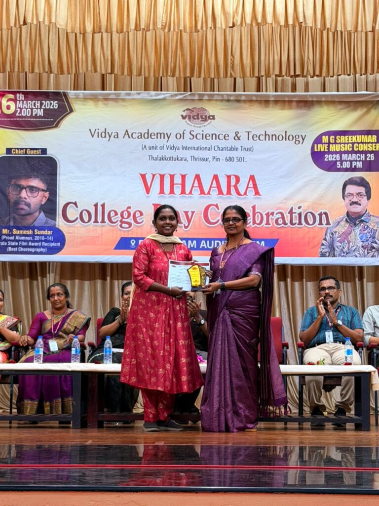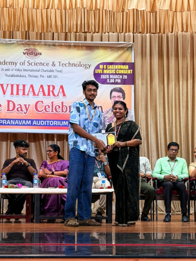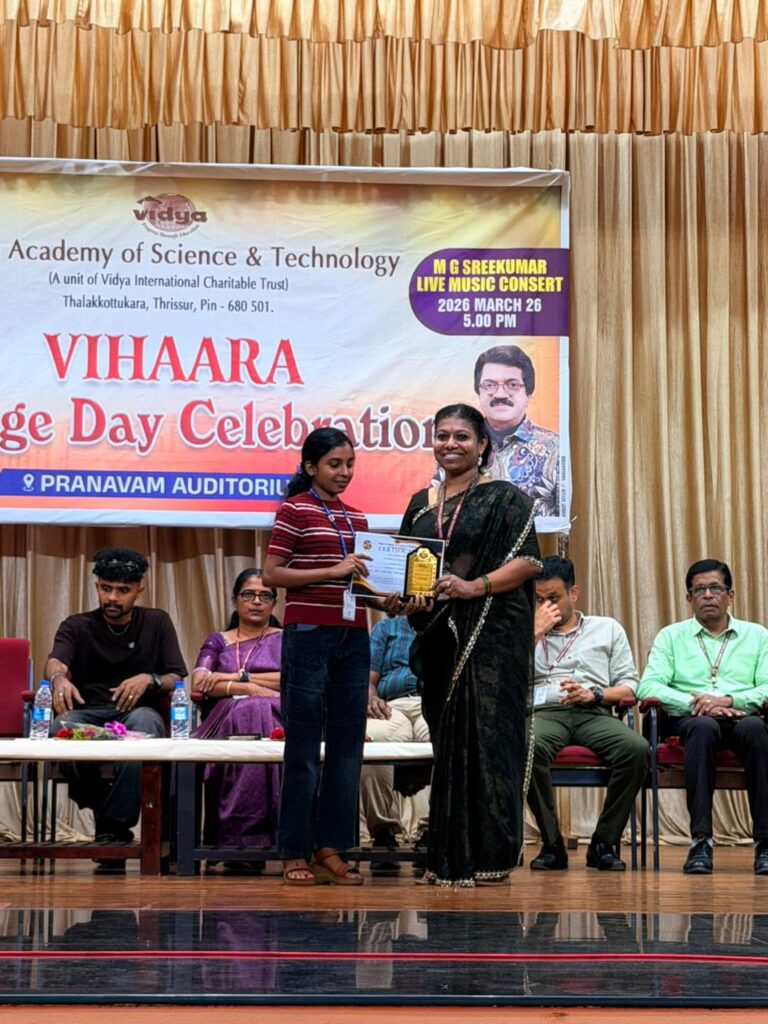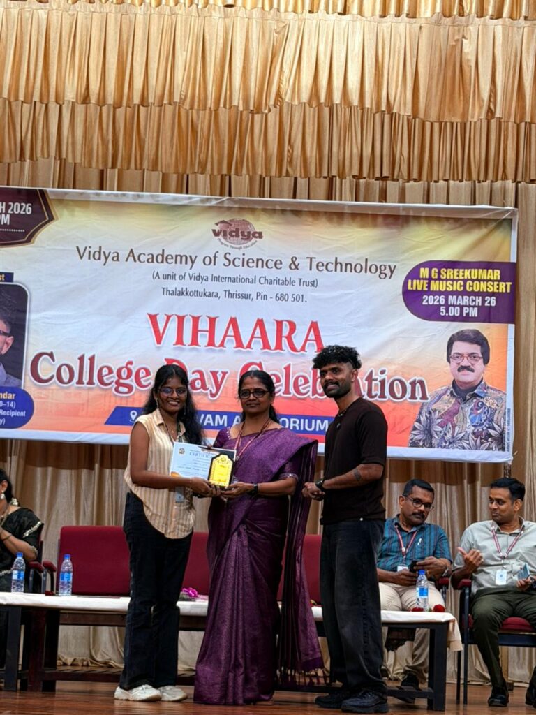 The College Day celebration, VIHAARA 2026, at Vidya Academy of Science and Technology on 26 March 2026 unfolded as a spectacular display of talent and unity. Conducted in two phases, the event created a dynamic platform where students and faculty came together to celebrate creativity, culture, and togetherness in an energetic and festive environment.The festivities commenced with impressive performances by students from various departments. The AI & ML Department opened the cultural segment with innovation and energy, followed by the Civil Engineering Department, which demonstrated creativity and delivered a vibrant performance. The Mechanical Engineering Department showcased precision and talent, while the Electrical & Electronics Engineering Department concluded the first set with flair and enthusiasm