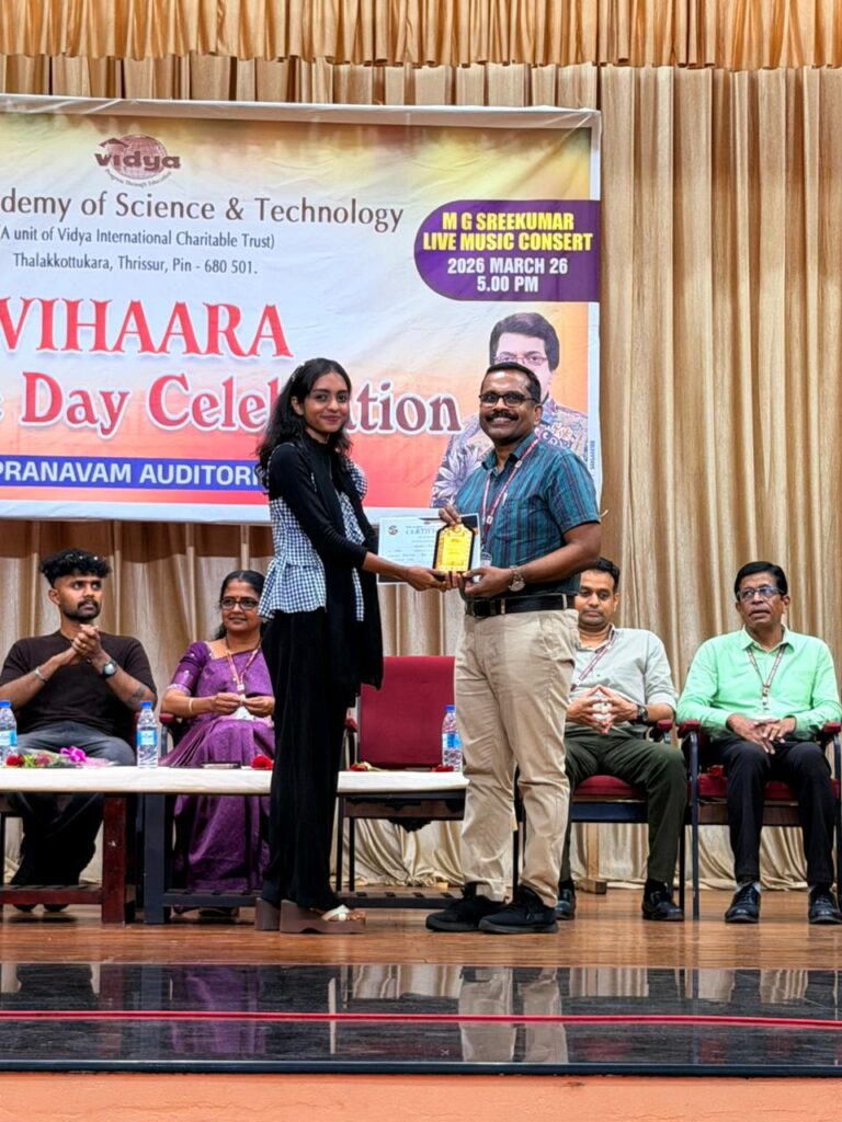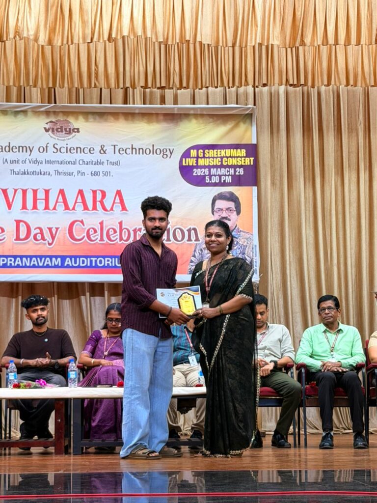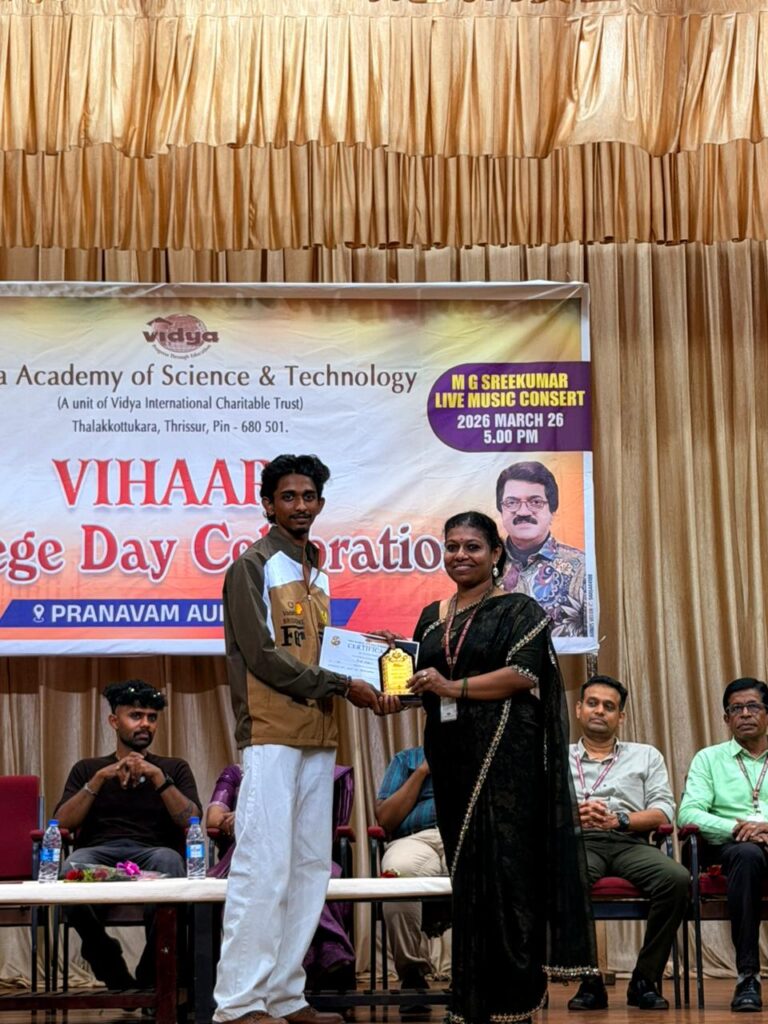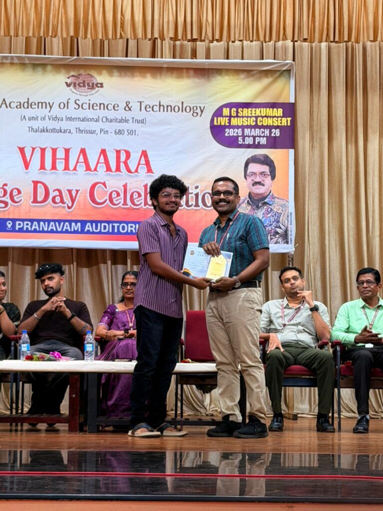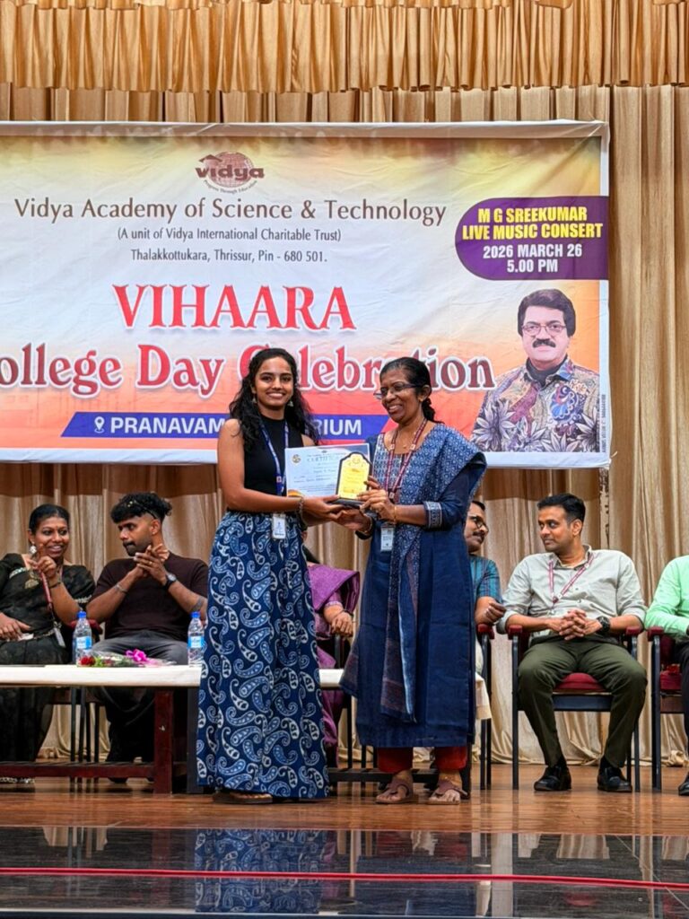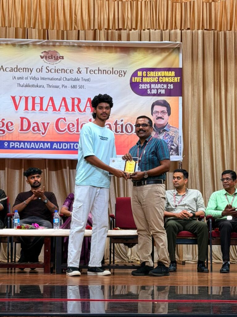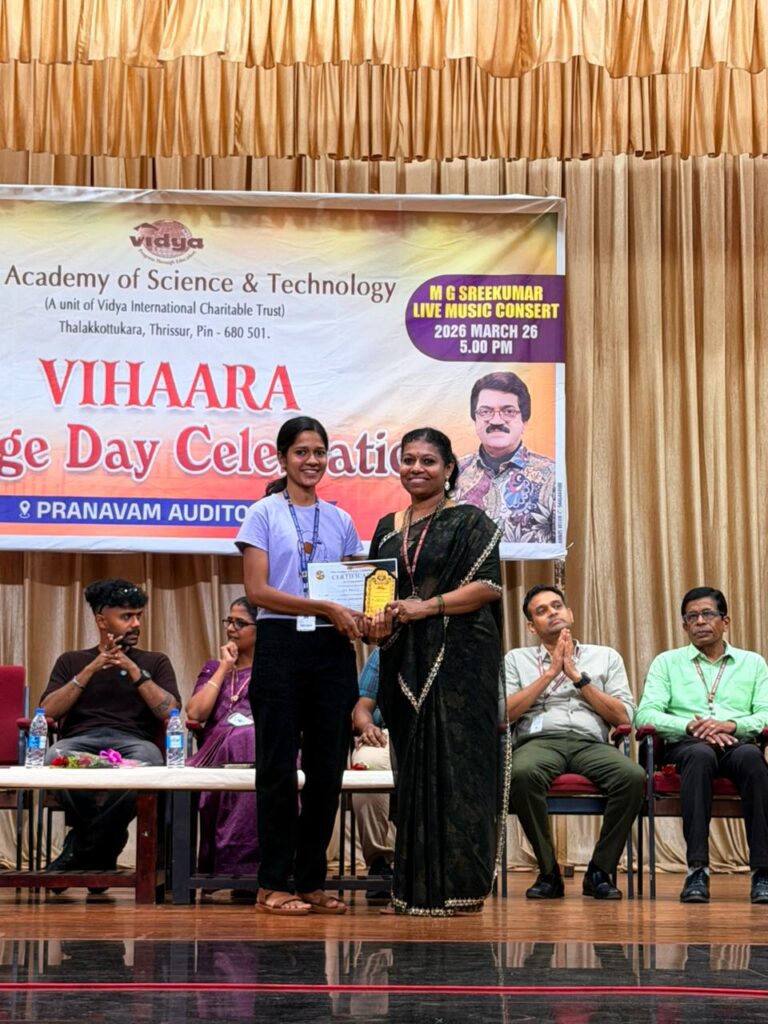The College Day celebration, VIHAARA 2026, at Vidya Academy of Science and Technology on 26 March 2026 unfolded as a spectacular display of talent and unity. Conducted in two phases, the event created a dynamic platform where students and faculty came together to celebrate creativity, culture, and togetherness in an energetic and festive environment.The festivities commenced with impressive performances by students from various departments. The AI & ML Department opened the cultural segment with innovation and energy, followed by the Civil Engineering Department, which demonstrated creativity and delivered a vibrant performance. The Mechanical Engineering Department showcased precision and talent, while the Electrical & Electronics Engineering Department concluded the first set with flair and enthusiasm