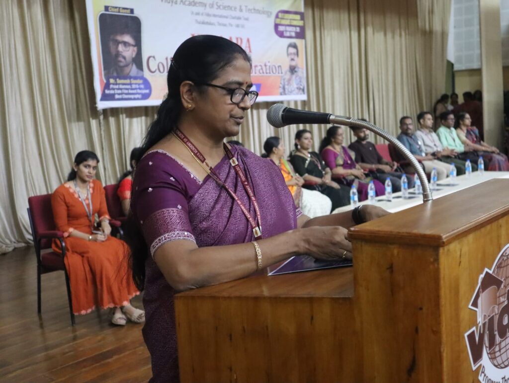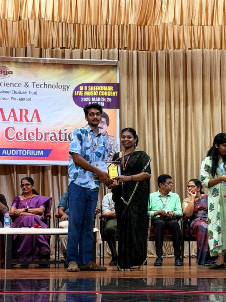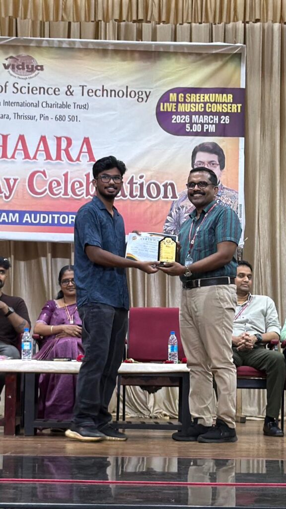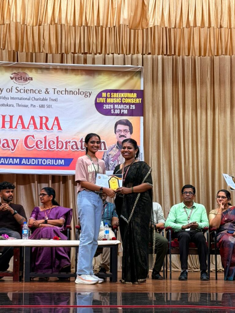 The program commenced with an invocation song by Yamini Vijayan (S6, CE Dept) setting a graceful tone for an evening filled with captivating performances and inspiring moments.The inaugural ceremony was a special and proud moment for Vidya, as it was graced by distinguished alumnus Mr Sumesh Sundar (recipient of Kerala State Film Award for Best Choreography, 2010–2014 Batch, PE Dept) who formally inaugurated the event.Mr Sumesh fondly remembered the encouragement he received from the college to start his initiative D’Addiction (Dance Club of Vidya). He also shared his experiences with the dance club D’Addiction at Vidya, highlighting how, under his leadership, the club achieved several notable successes The program was presided over by  Dr Sunitha C (Principal), who emphasized the importance of such celebrations in fostering creativity unity and a vibrant campus spirit. As a gesture of love  and admiration, a memento  was presented to Mr. Sumesh Sundar by the Principal.The formal segment of VIHAARA 2026 concluded with a heartfelt expression of gratitude by Srivya E. S (Chairperson, (S6, CE Dept)