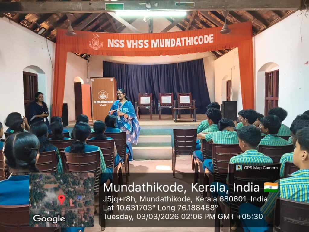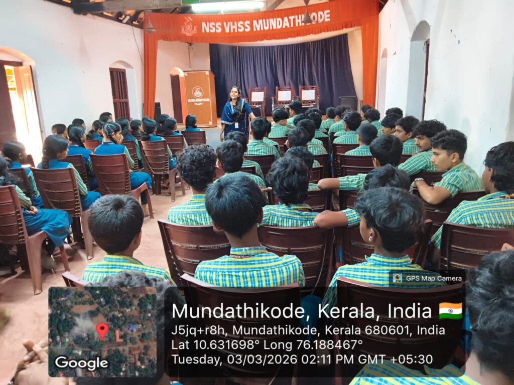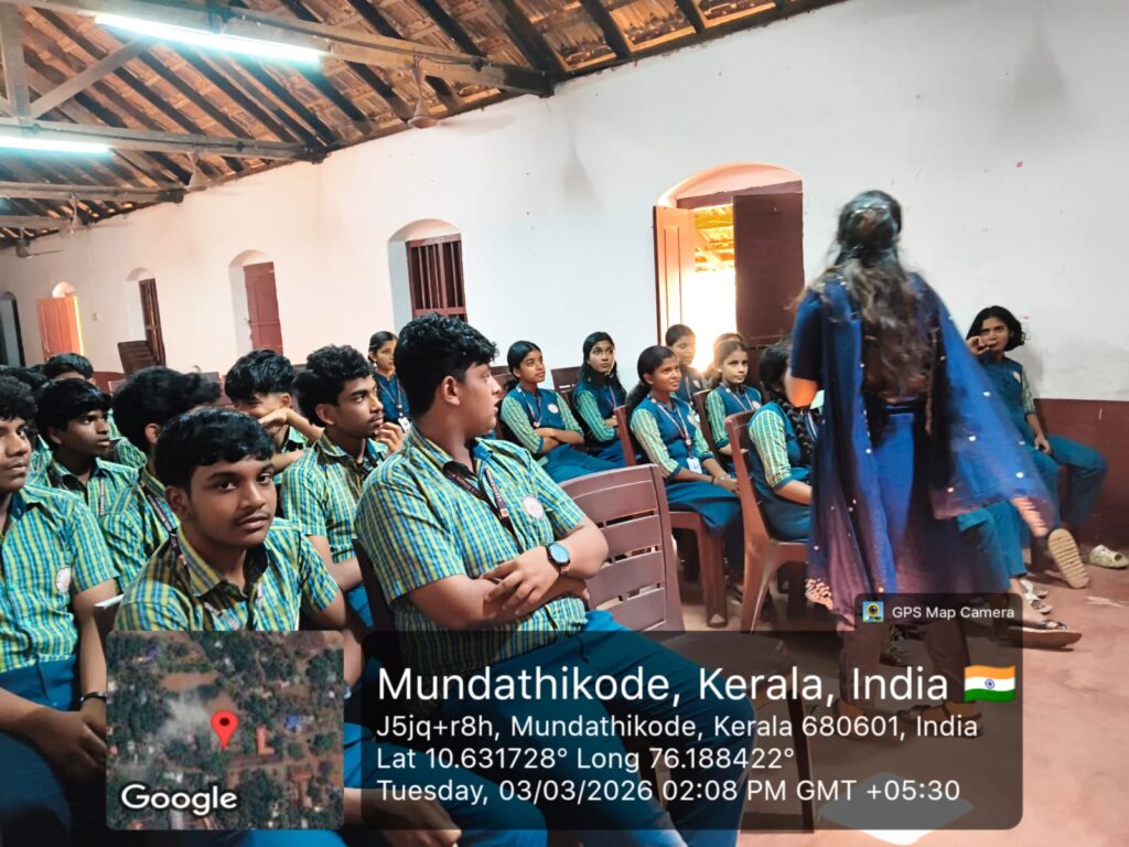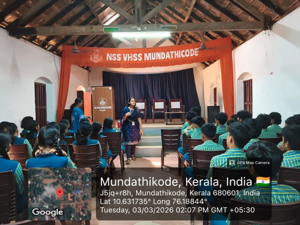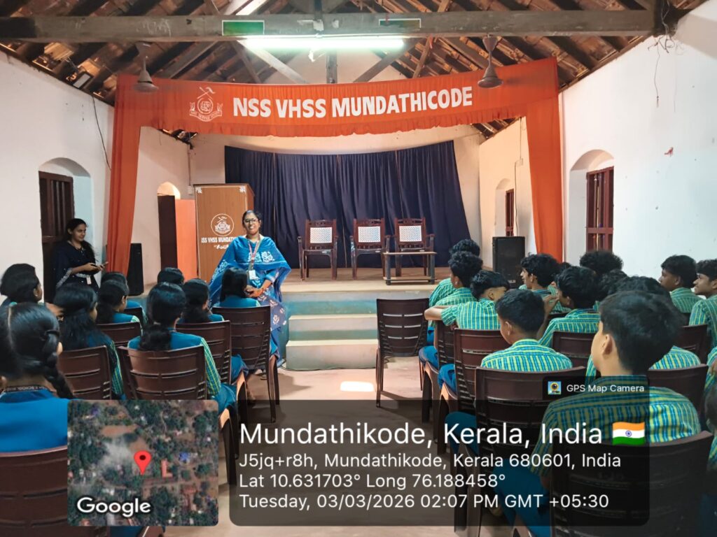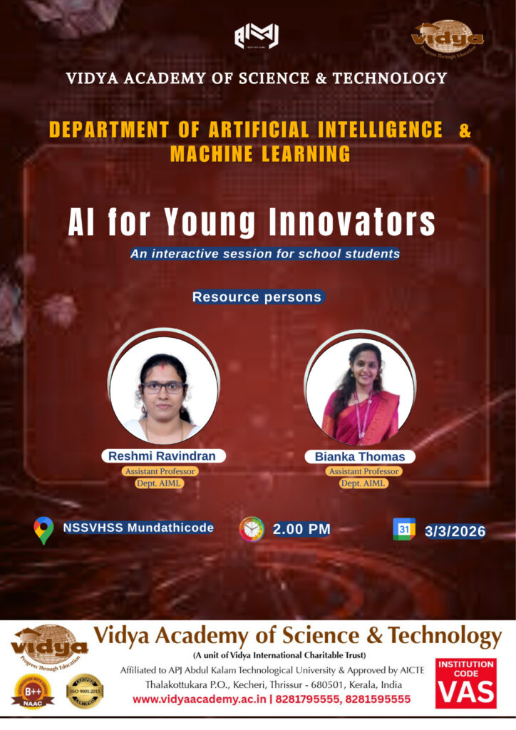 With the aim of introducing high school students to the basic concepts of Artificial Intelligence and its real-world applications, an interactive session on the topic “AI for Young Innovators” was organized at NSSVHSS Mundathicode, Thrissur, on 03 March 2026. The session was conducted by the Department of Artificial Intelligence and Machine Learning. Ms. Reshmi Ravindran (Asst Prof, AIML Dept) and Ms. Bianka Thomas (Asst Prof, AIML Dept) represented the department and served as the Resource Persons for the event.