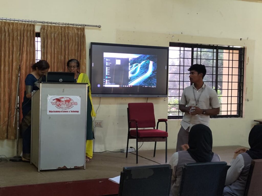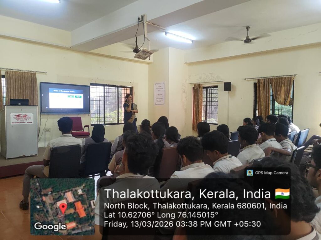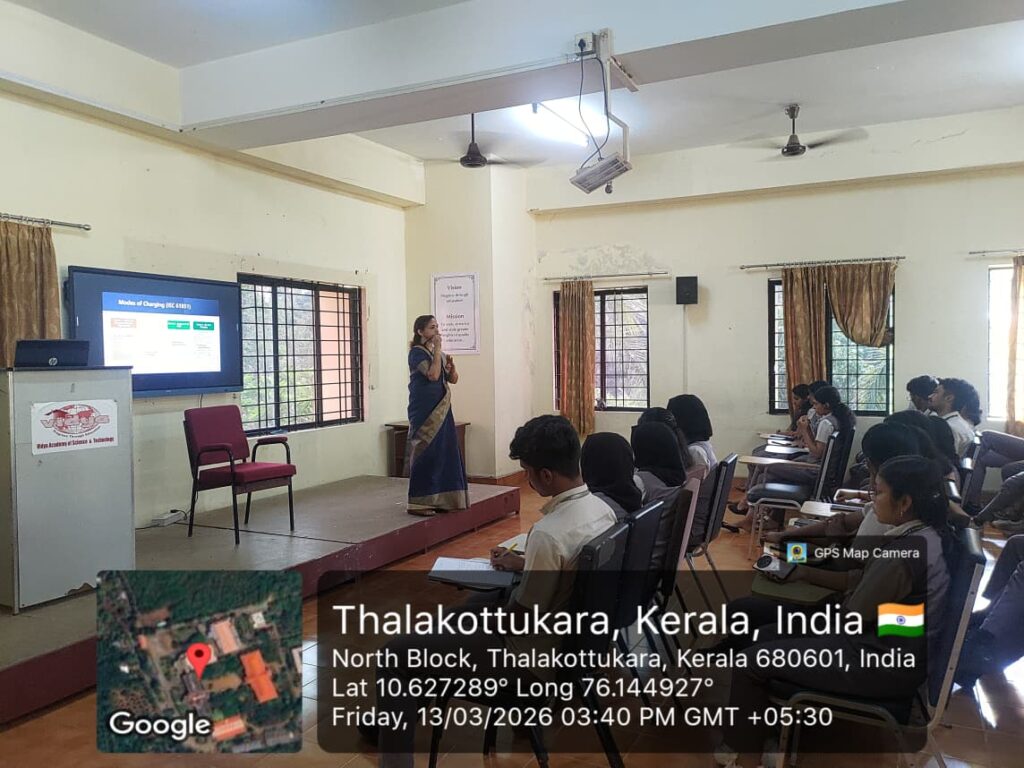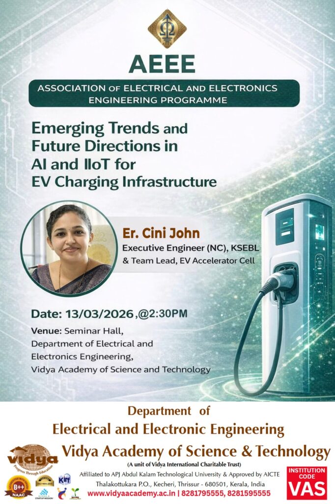 The Association of Electrical and Electronics Engineering (AEEE) of the Department of Electrical and Electronics Engineering, Vidya Academy of Science and Technology (VAST), Thrissur, organized a technical talk titled “Emerging Trends and Future Directions in AI and IIoT for EV Charging Infrastructure” on 13 March 2026 at 2:30 PM in the Seminar Hall of the EEE Department.