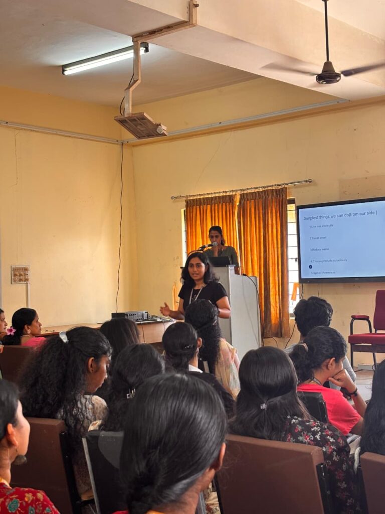 The session was then started by Gayathri, where she explained the concept of global warming and how the increase in greenhouse gases is leading to a rise in the Earth’s temperature. She discussed several examples such as melting glaciers, rising sea levels, extreme weather conditions, forest fires, and the loss of biodiversity. She also highlighted how human activities like deforestation, industrialization, and excessive use of fossil fuels contribute significantly to global warming. Through different examples, she explained the long-term effects it can have on ecosystems, wildlife, and human life.