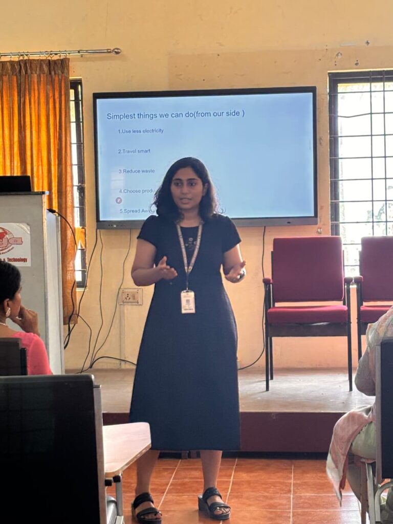 Furthermore, she emphasized the importance of adopting sustainable practices such as reducing carbon emissions, planting trees, conserving energy, and promoting eco-friendly habits in daily life. The presentation was delivered in an engaging and informative manner, helping the audience clearly understand the seriousness of the issue.