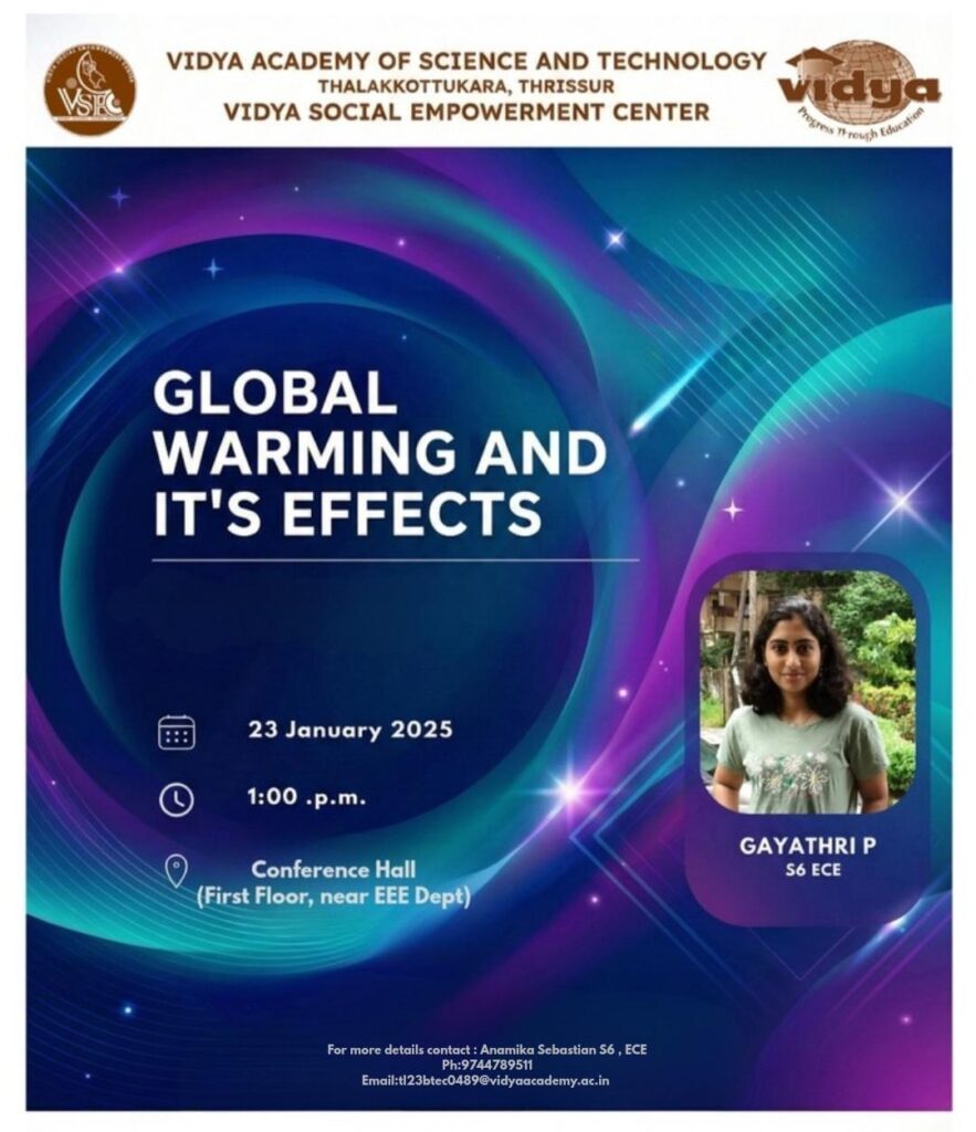 The session was handled by Gayathri P (S6, ECE Dept), who spoke in detail about the causes and impacts of global warming through various real-life examples. The anchoring of the program was done by Anamika Sebastian (S6, ECE Dept). The program began with a silent prayer followed by an introduction about VSEC and a brief introduction of the resource person. Suraj Krishna K (S4, CSE Dept) and Sooraj (S4, CSE Dept) photographed the event.