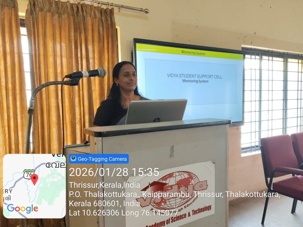 Vidya Student Support Cell (VSSC) conducts various sessions aimed at enhancing the well-being of staff and students. VSSC organized a session on the Mentoring System with Students at Vidya Academy of Science & Technology, Thrissur, with the objective of strengthening the mentor-mentee relationship and supporting students in both academic and personal development on 15 January 2026 and 28 January 2026.