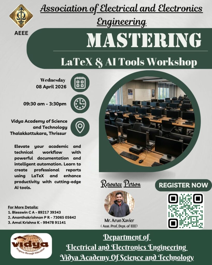 The Association of Electrical and Electronics Engineers (AEEE), successfully organized a comprehensive full-day workshop titled “Mastering LaTeX & AI Tools” on 08 April 2026. The event brought together an enthusiastic mix of +1, +2, +2 completed, and B.Tech students, offering them a valuable opportunity to gain hands-on experience in modern academic and technological tools.
