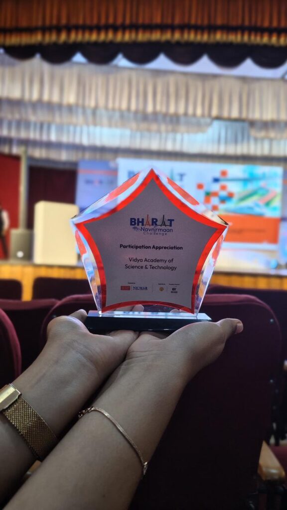 A team of B.Tech Civil Engineering students (2023 batch)-Dharsana M. J (S6,CE Dept), Celin K. Jose (S6,CE Dept) and Srivya E. S(S6,CE Dept).-under the guidance of Dr. Abhilasha P. S. (Prof, HoD, CE Dept)  actively participated in the City Round of the Bharat Nav Nirman Challenge 2026. The event was organized by The Times of India in association with NICMAR University and was held on 07 March 2026 at A.J. Hall, Kaloor, Ernakulam. The competition witnessed participation from nearly 30 engineering colleges across Kerala.